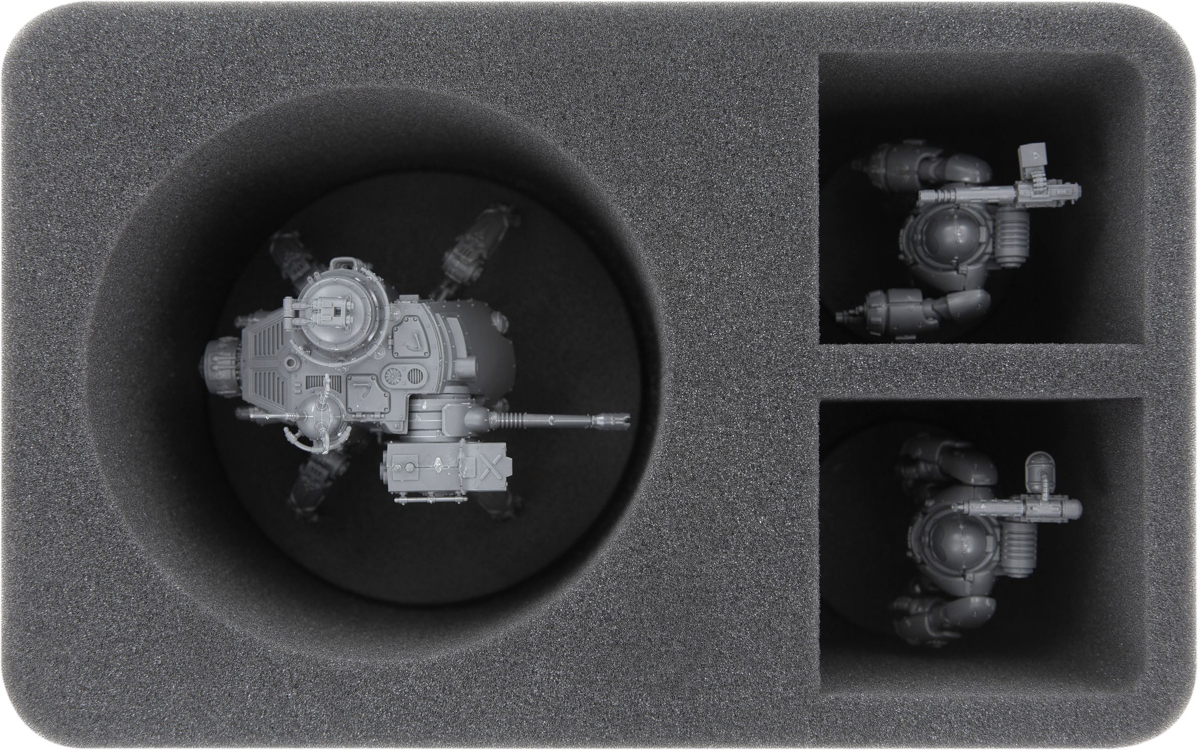 - 1 Half-Size foam tray with 1 miniature-precisely cut compartment for the Onager Dunecrawler and 2 compartments for Kastelan Robots and models with similar dimensions (HS110WH51)