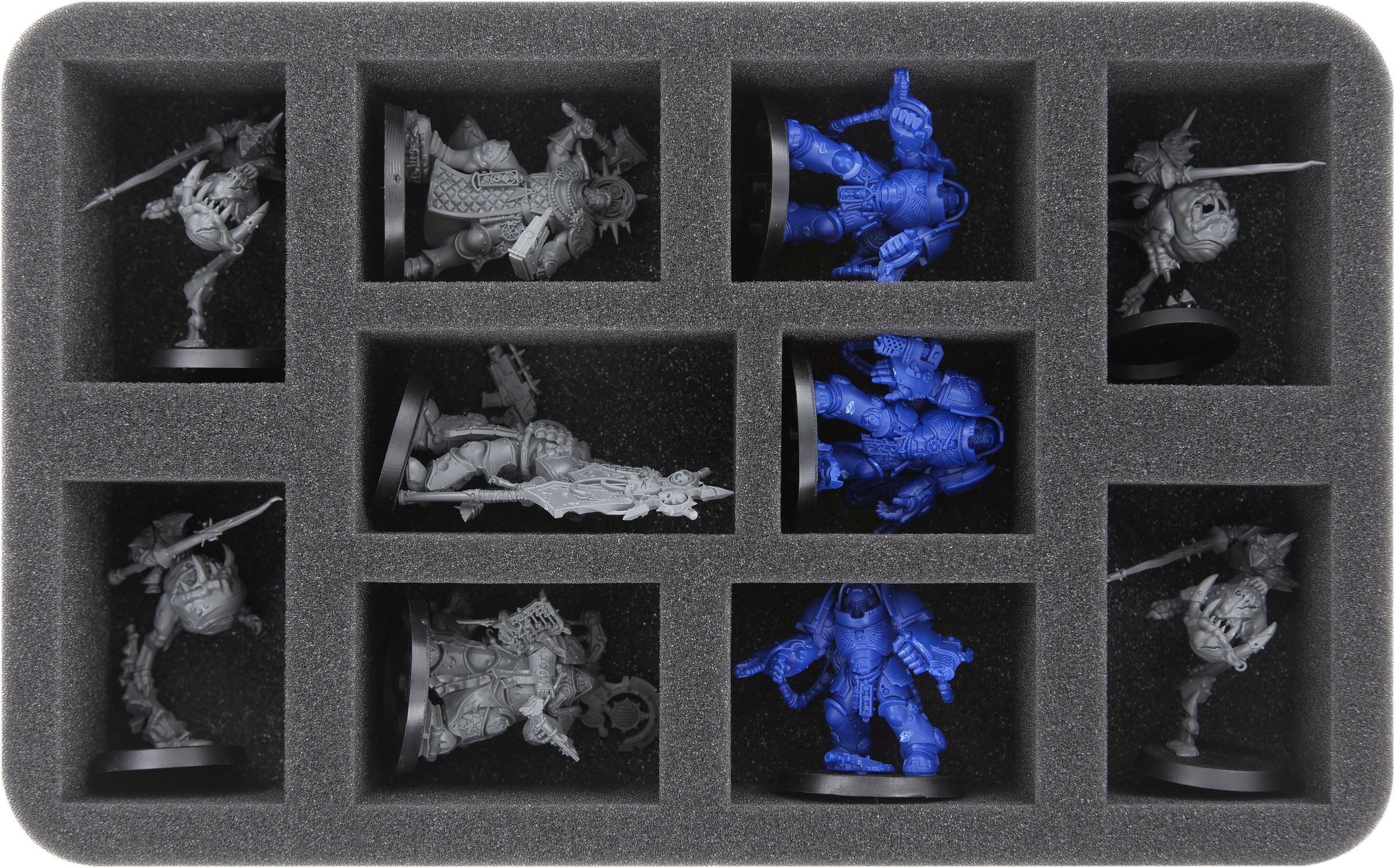 The foam trays with the 10 compartments each are ideal for infantry units, e.g. Tech-Priest Engineer, Skitarii Vanguards, Sicarian Ruststalkers or Cybernetica Datasmith.