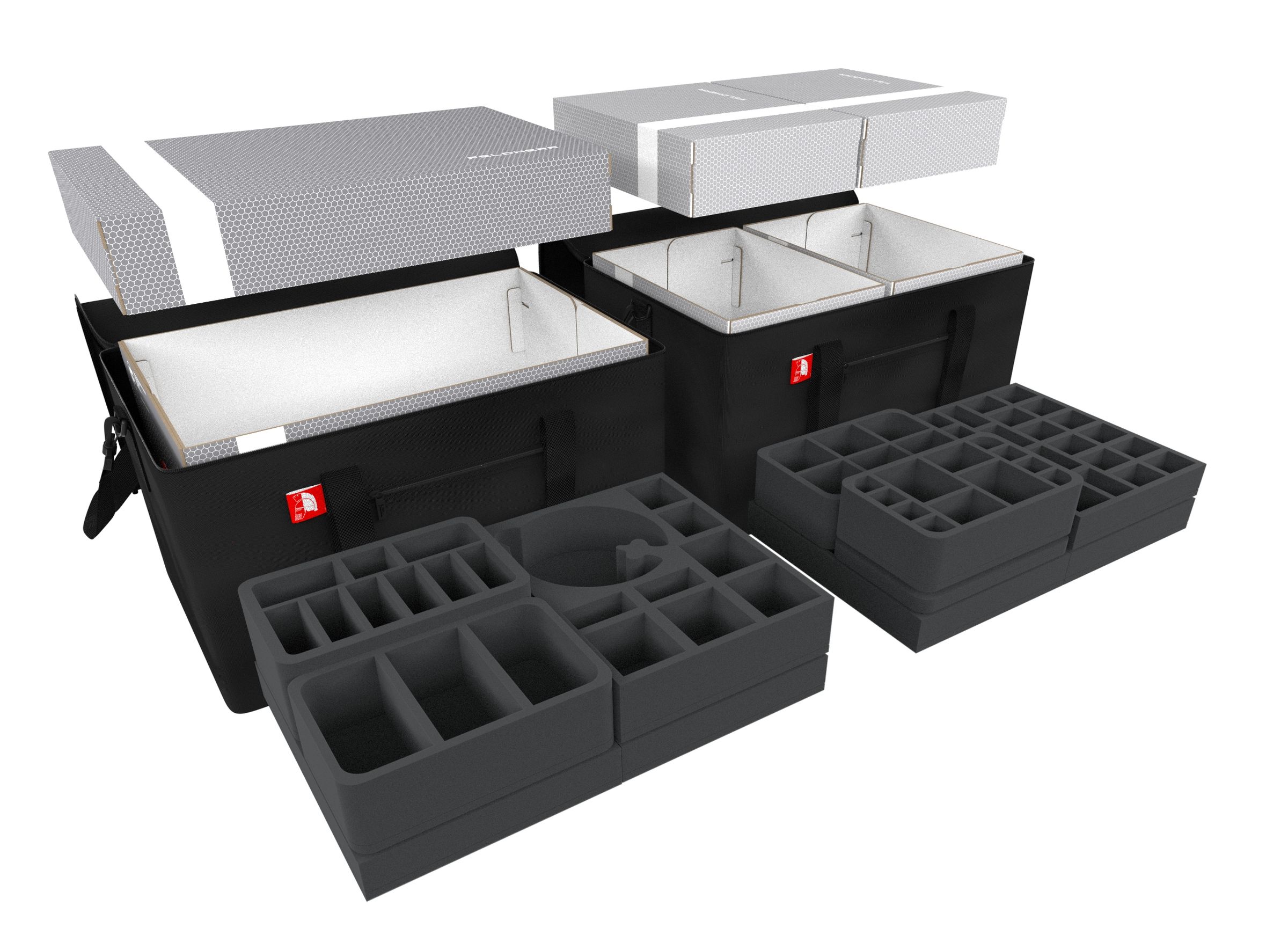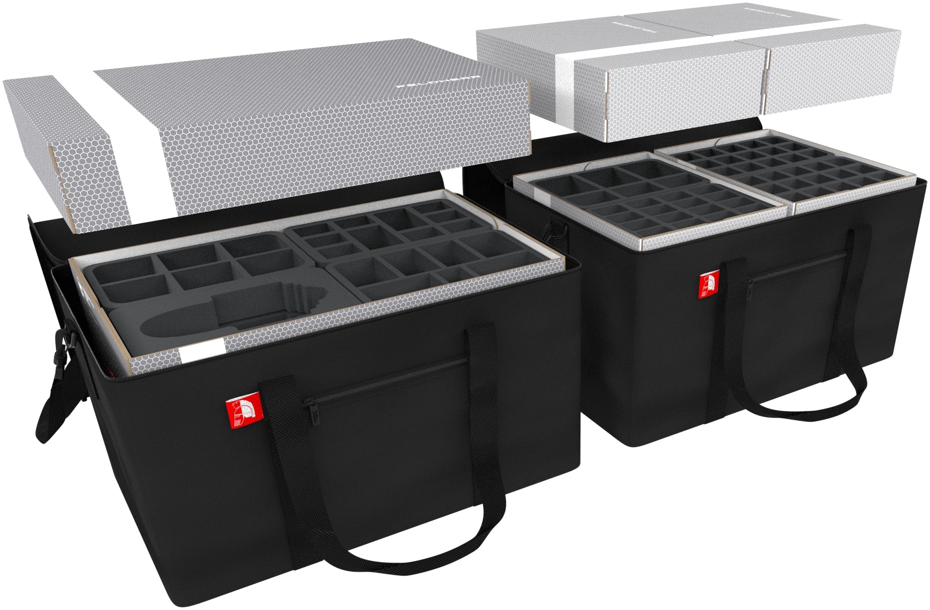 This set contains 2 Transporter bags, filled with fitting Feldherr Storage Boxes and foam trays.