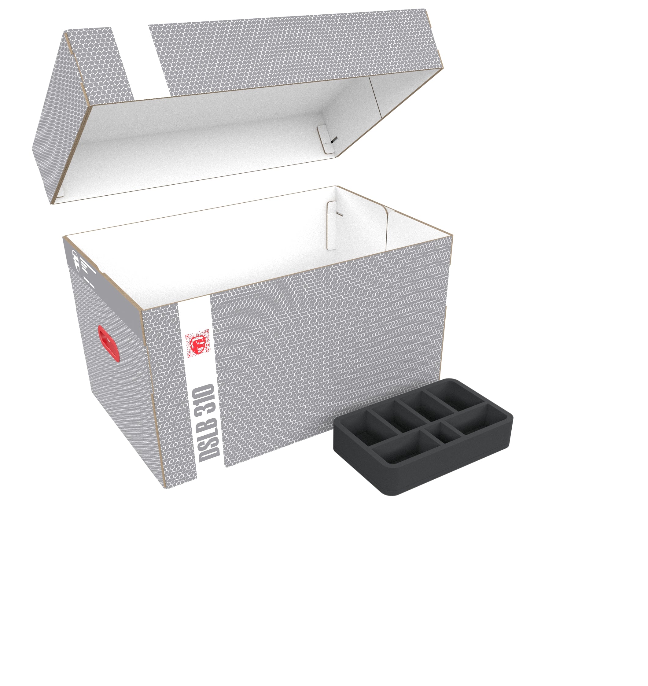 The Storage Box DSLB310 is made of coated, corrugated cardboard. This makes it not only pleasantly light but also very tear-resistant and stable. The attachable lid reliably protects the contents from dust and other external influences. With the appropriate foam trays, miniatures, game material, and all other goods can be stored safely — and conveniently transported with the two plastic-reinforced carrying handles on the sides.