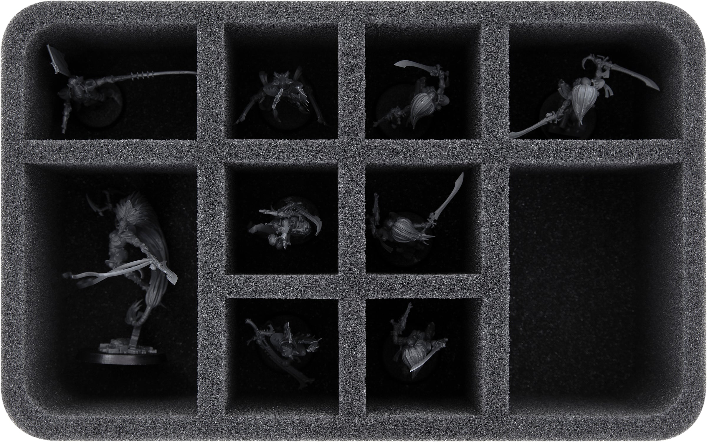 - 1 Half-Size foam tray with 10 compartments for bulky infantry models like Winged Autarch, Howling Banshees, Wraithguard, Harlequin Troupe, Solitaire, Death Jester, and models with similar dimensions (HS050A100)