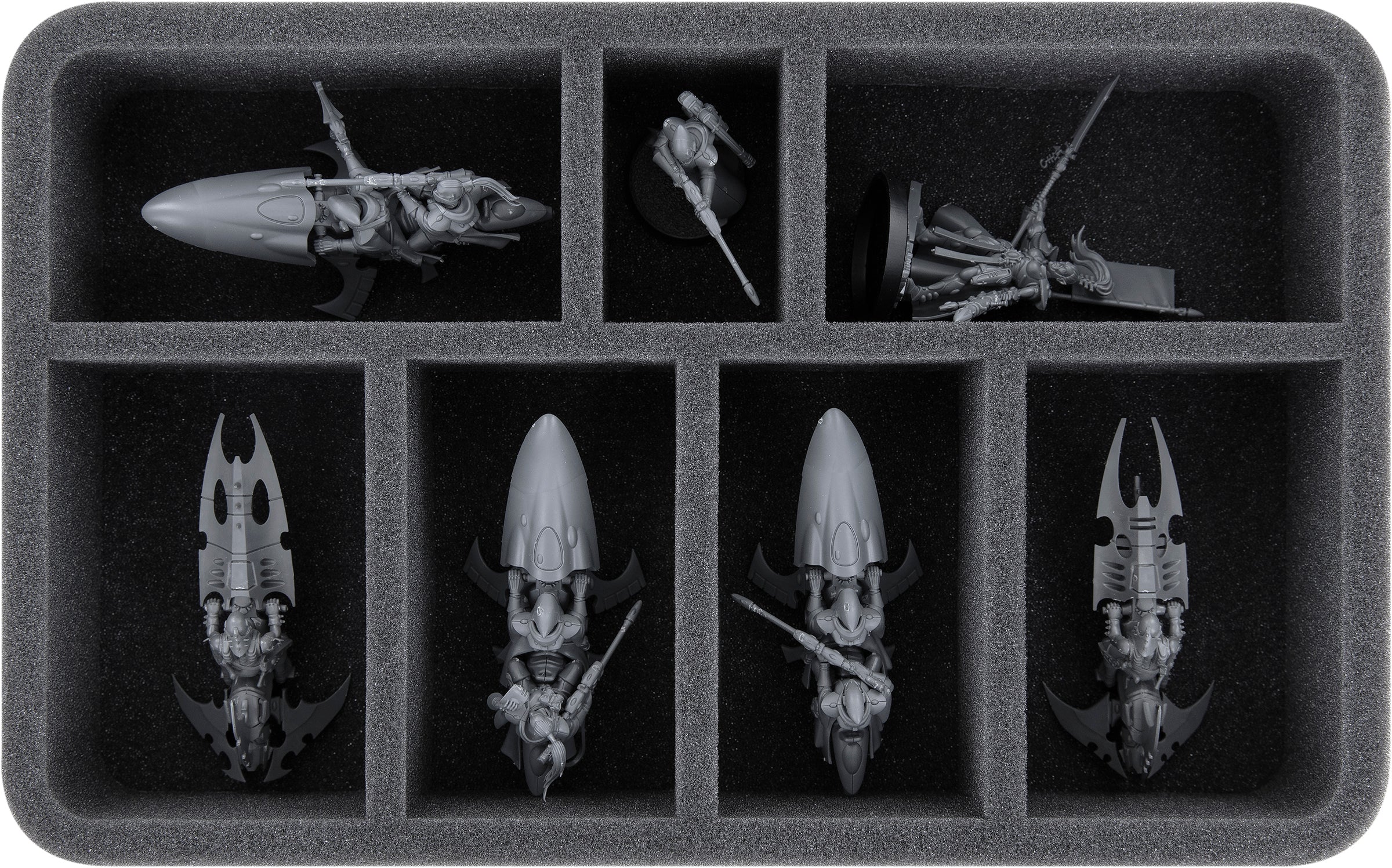 - 1 Half-Size foam trays with 7 compartments for Starweaver/Voidweaver without flying bases + bulky miniatures like Shadowseer, Death Jester and models with similar dimensions + separate flying base (HS080A027)