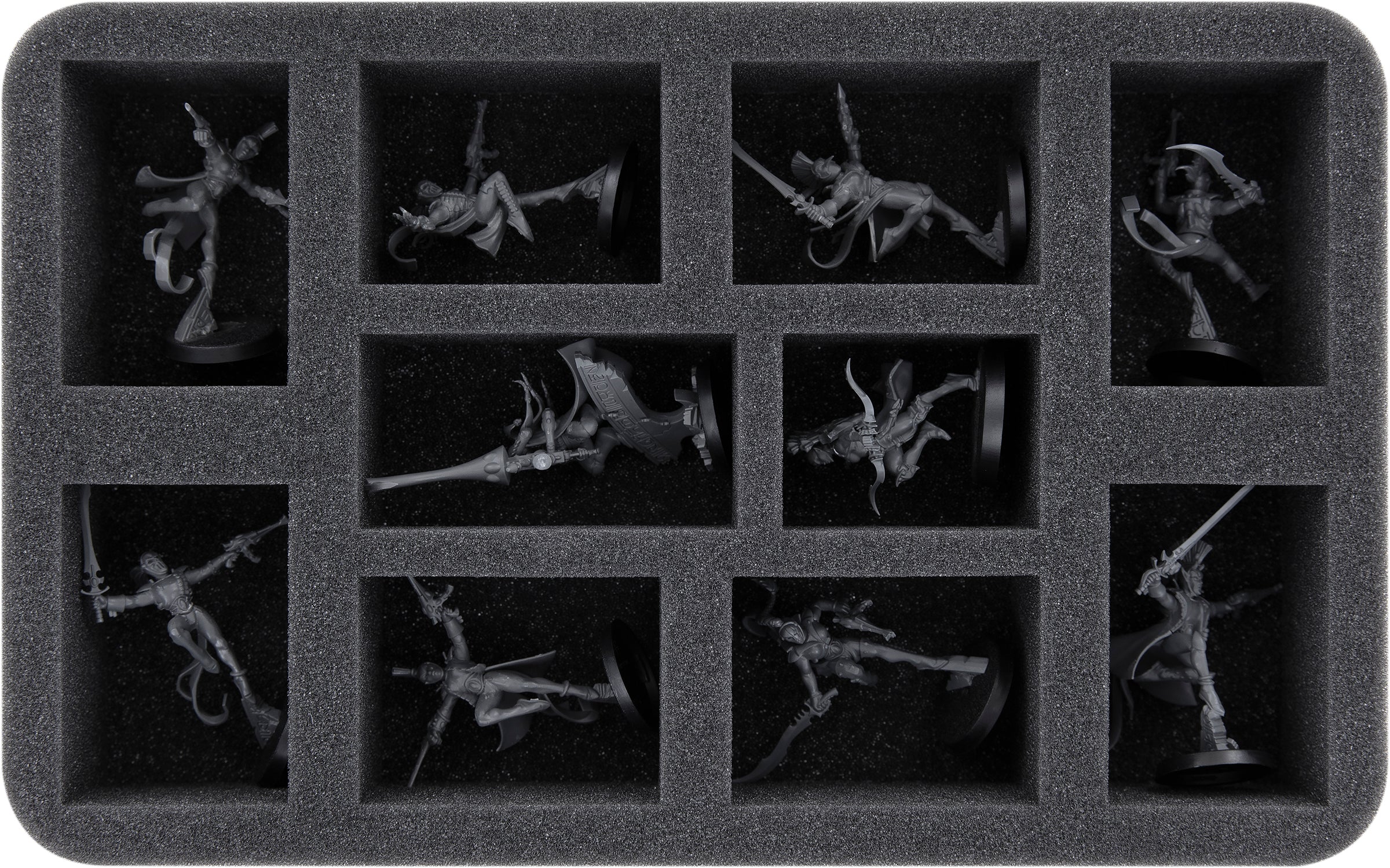 - 1 Half-Size foam trays with 10 compartments for bulky miniatures like Shadowseer, Death Jester, Solitaire, Harlequin Troupe and models with similar dimensions (HS045A029)
