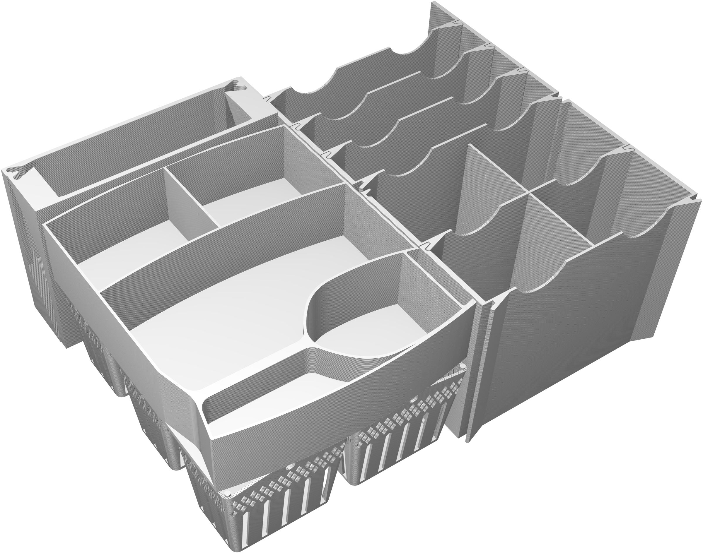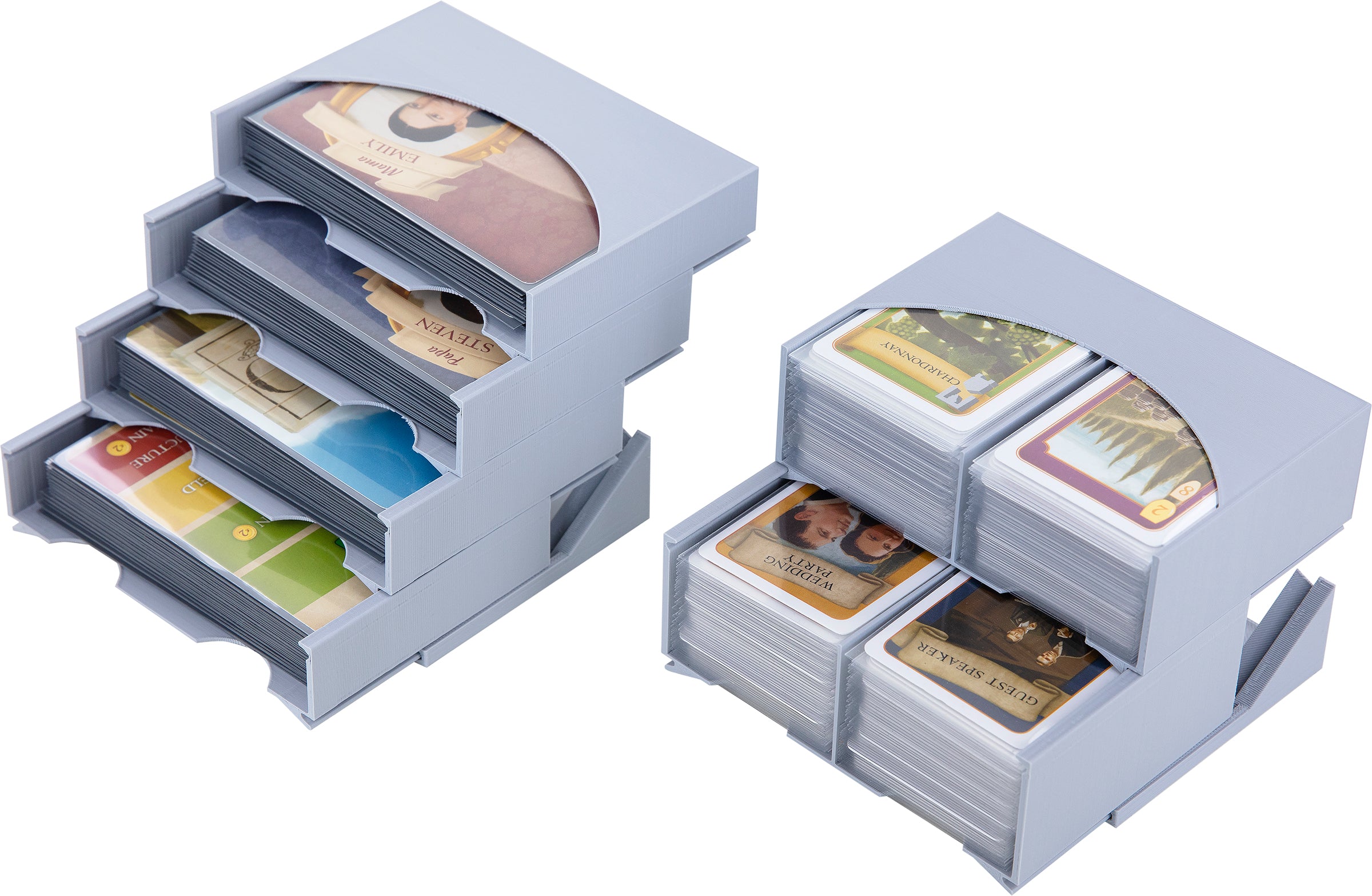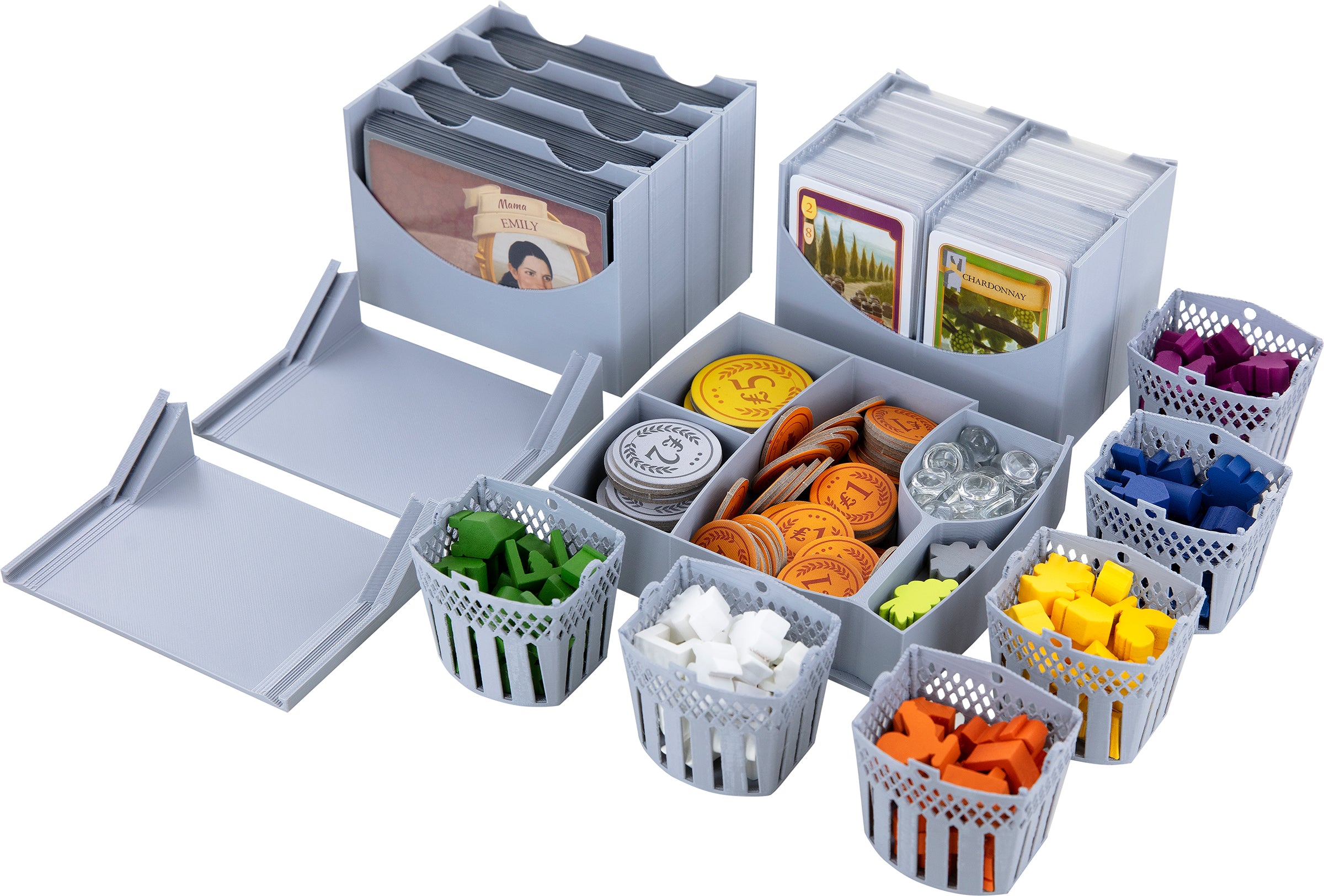 To successfully run a vineyard, you need not only a passion for grape products but also the craftsmanship and commercial skills. To allow you to concentrate fully on your vineyard, we take care of the organization of your box. The seven token holders and the two Duo State card holders ensure that your game material always remains clearly sorted. This eliminates the need for tedious pre-sorting and allows you to start playing faster. For a quick start of the game, just attach the card holders to the bottom parts and spread all trays on the game table. Now you can start playing with your friends.