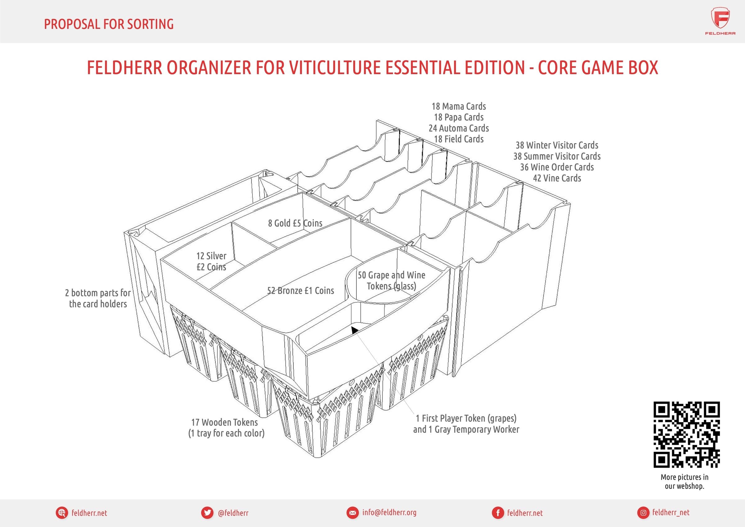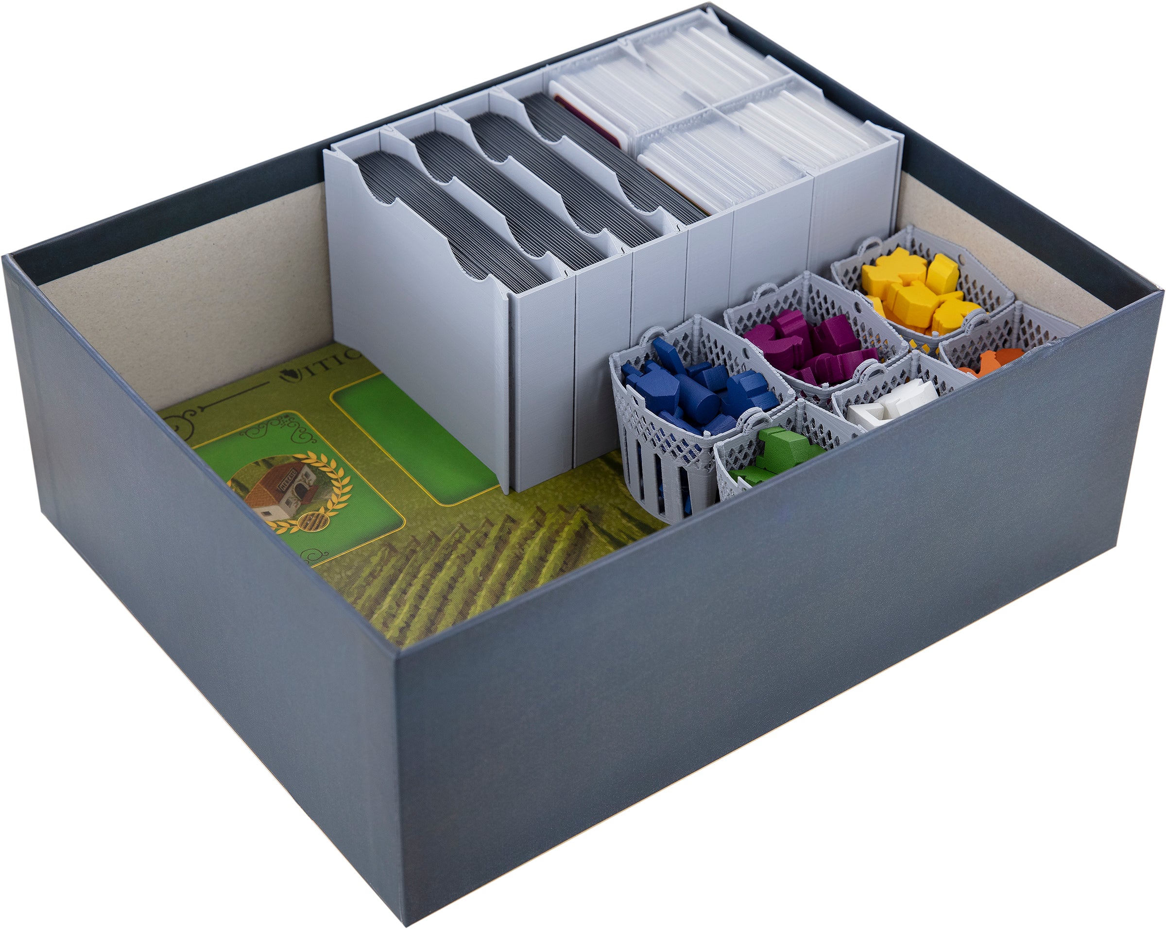 - The Organizer fits into the original core game box and offers space for the entire game material from the “Viticulture: Essential Edition”.