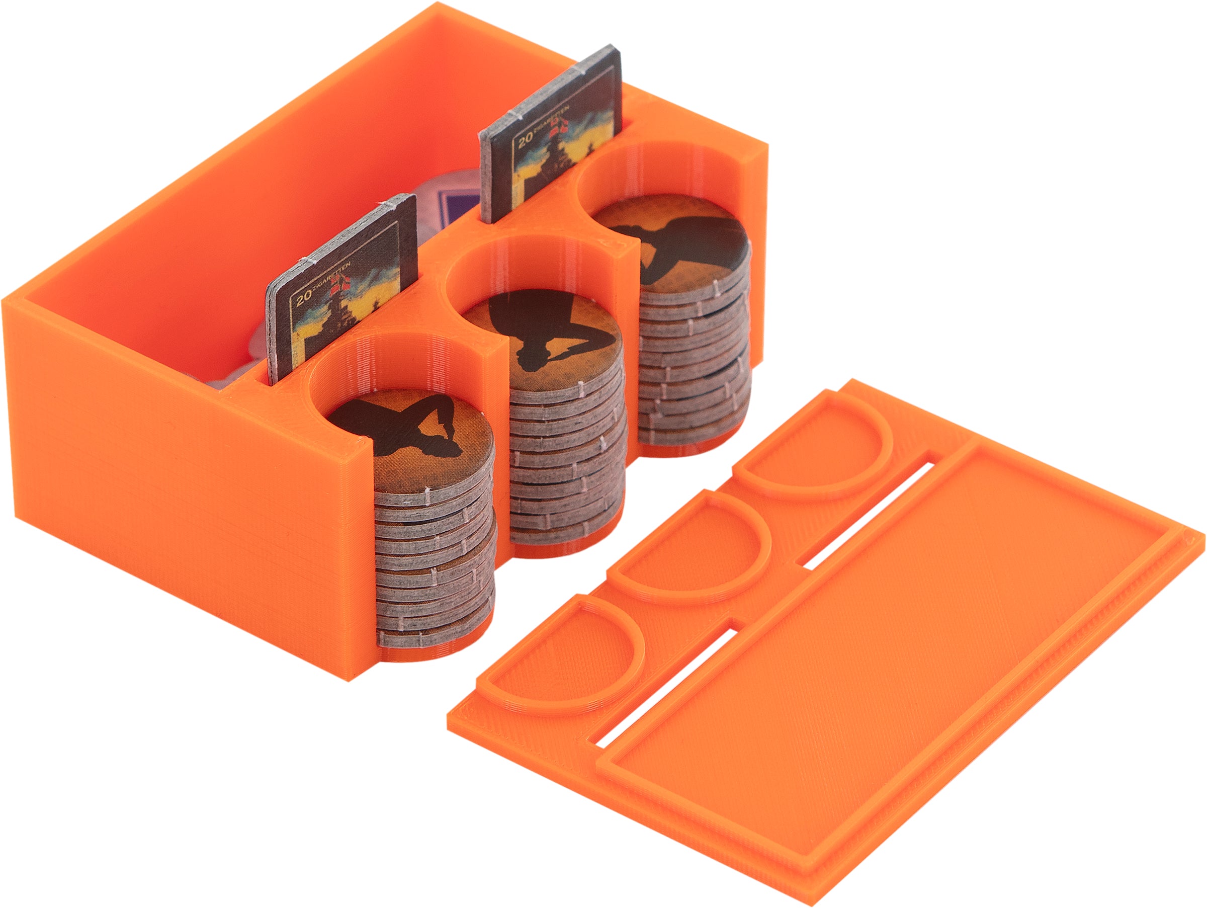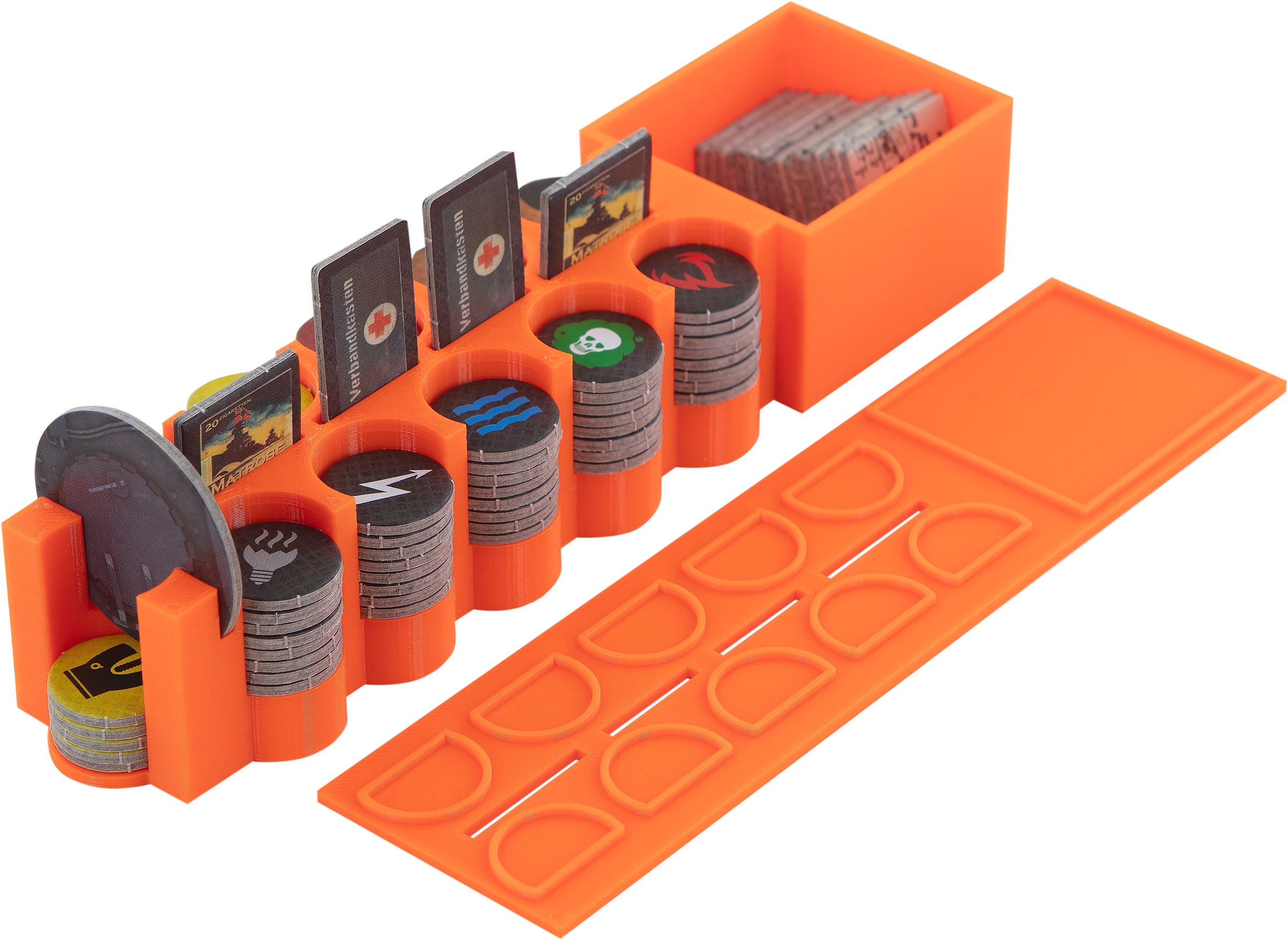 At the beginning of the game you simply take the token boxes, cards and the rest of the accessories from the tray and distribute them on the game table to your fellow players. You can now save yourself time-consuming sorting and arranging.