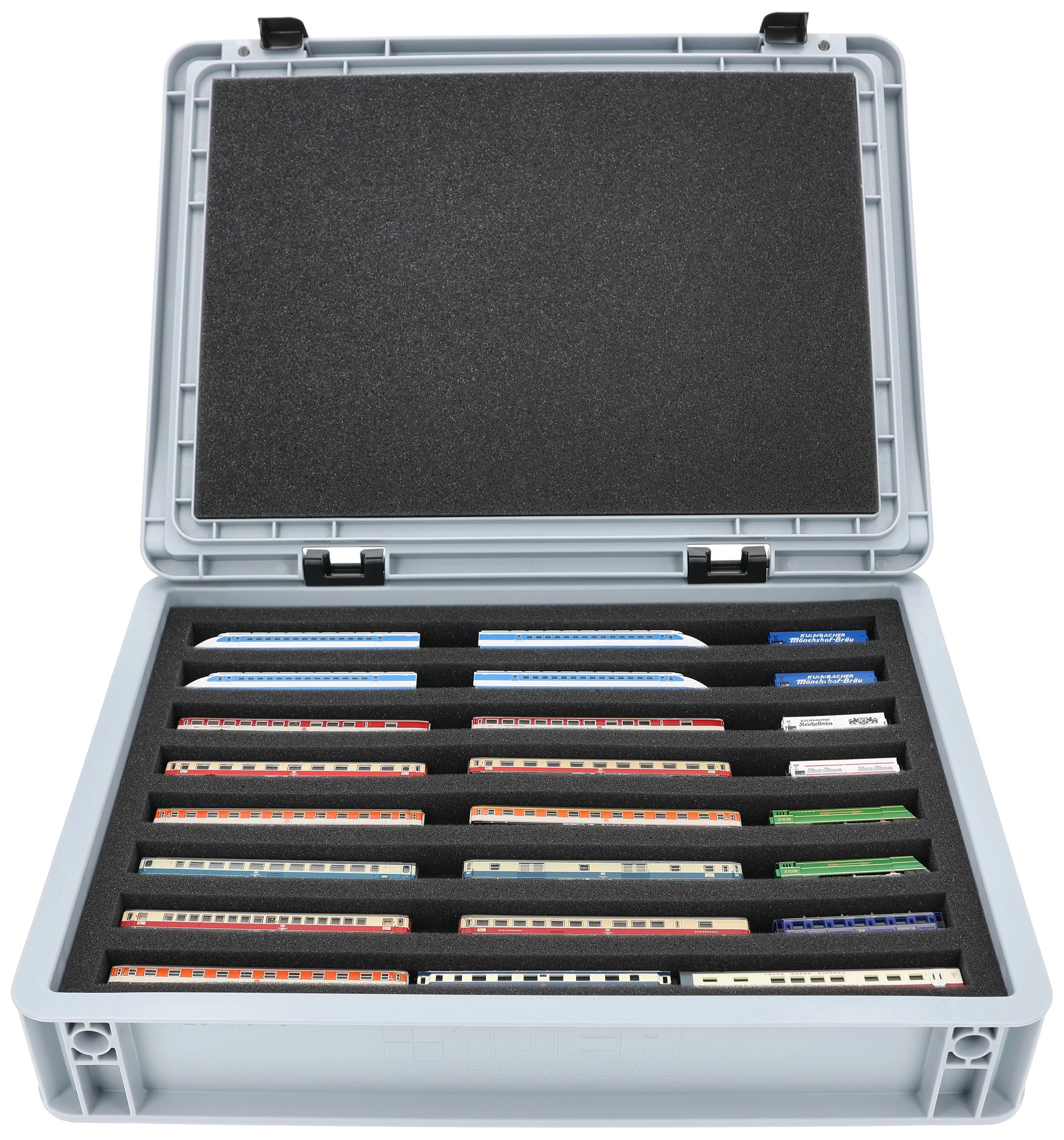 The 8 equal-sized compartments (each approx. 340 x 20 x 20 mm) are specially designed for Z scale models. Depending on their length, several wagons or locomotives can be placed side by side. The exact fit ensures that the models are securely fixed and do not slip during transport.