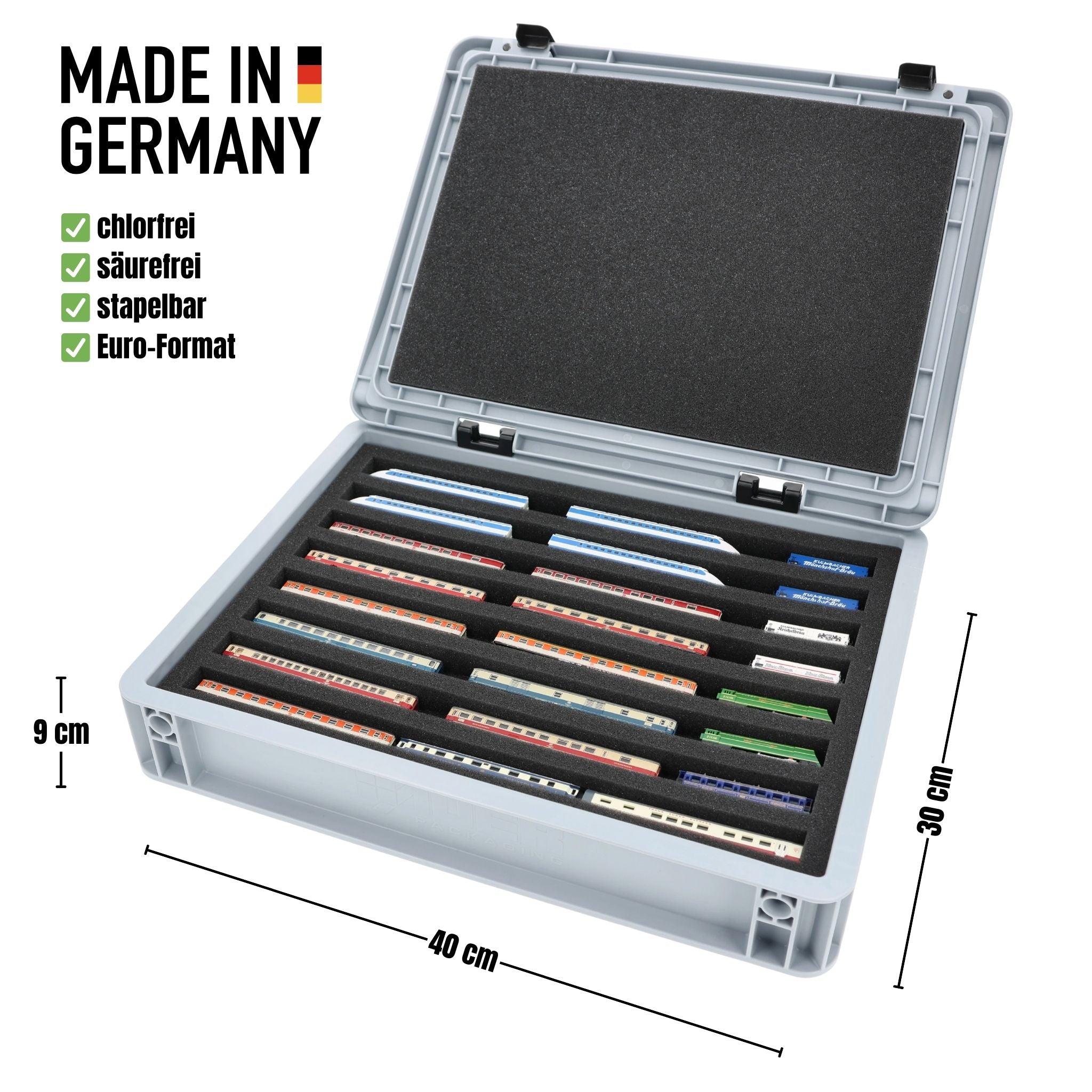 For anyone who wants to transport their Z scale locomotives, wagons and vehicles safely and compactly: this Feldherr set combines a stackable Eurobox with a custom-fit foam insert. Whether for trips to the model railroad club, module meetings, or as a space-saving storage solution at home - your models are well protected at all times.