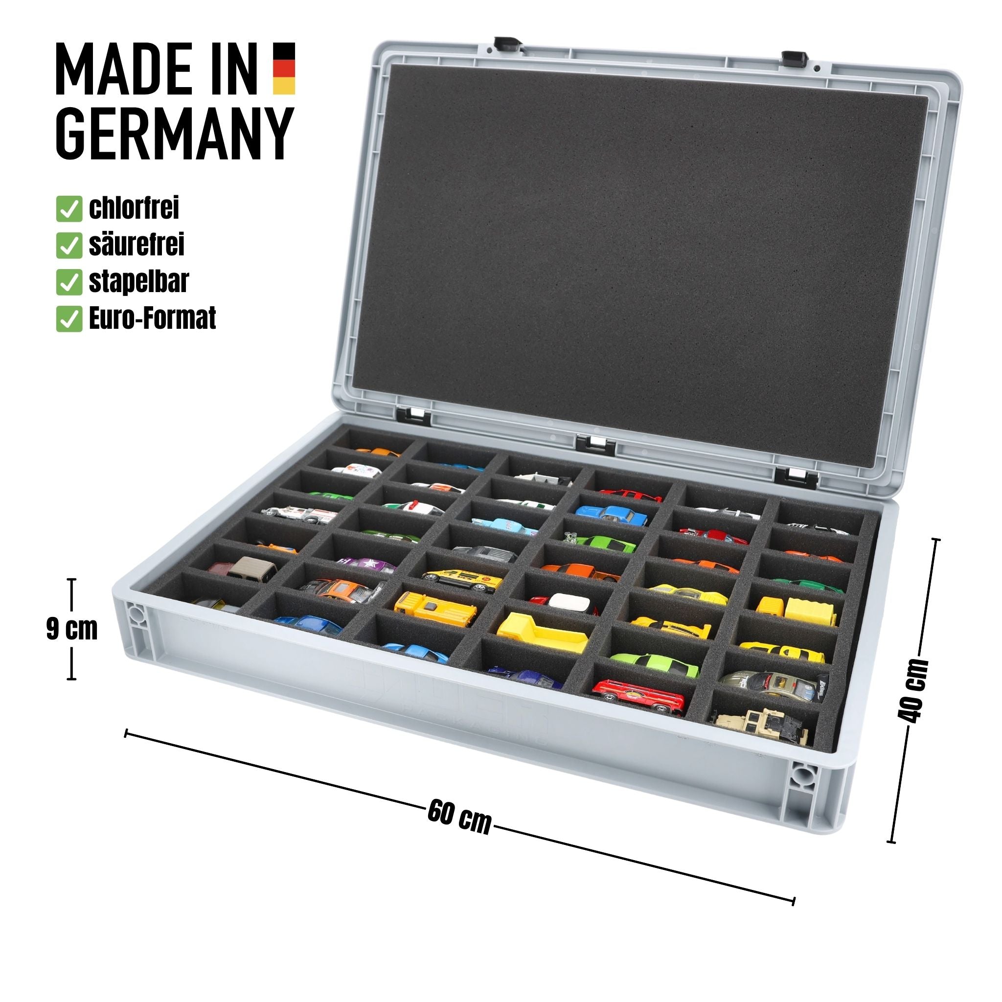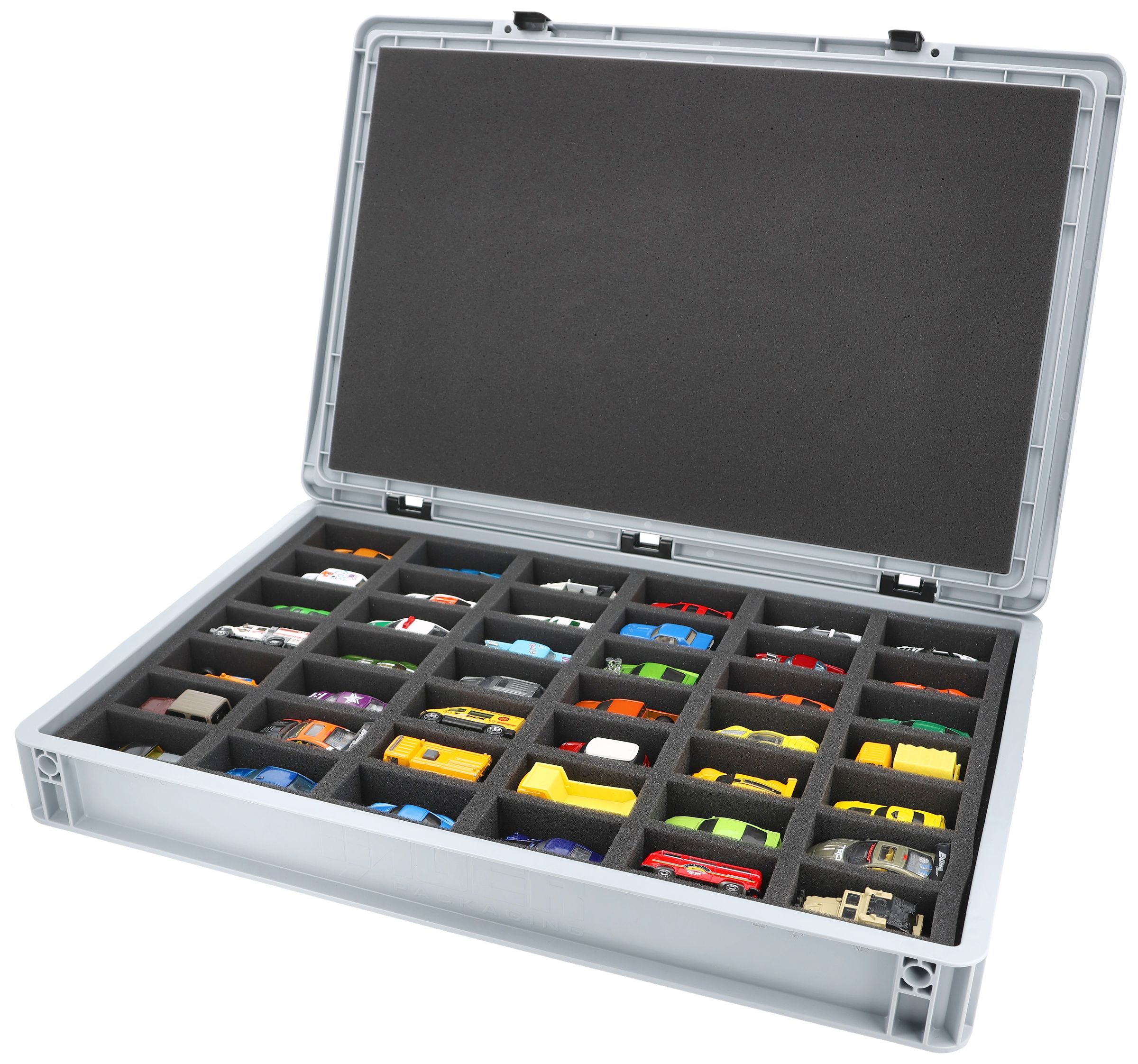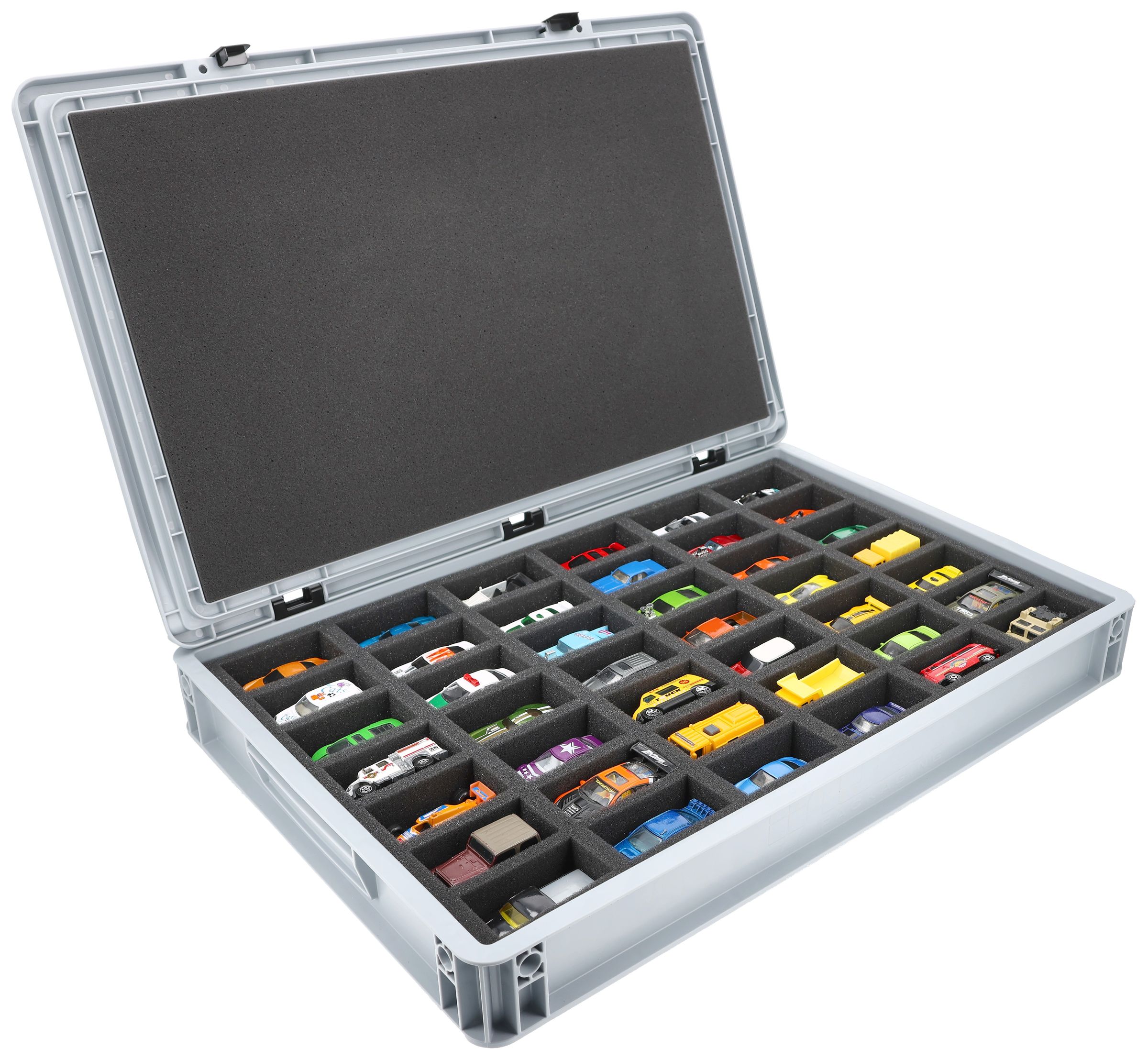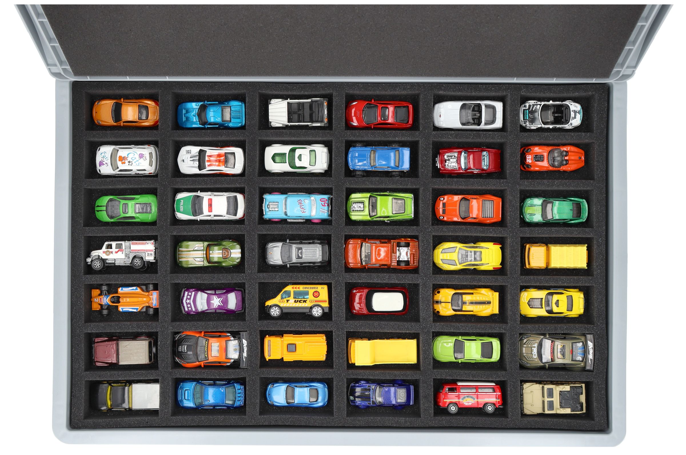 - Precision foam insert with 42 compartments for 1:64 scale die-cast vehicles - compartment dimensions approx. 80 x 42 x 30 mm