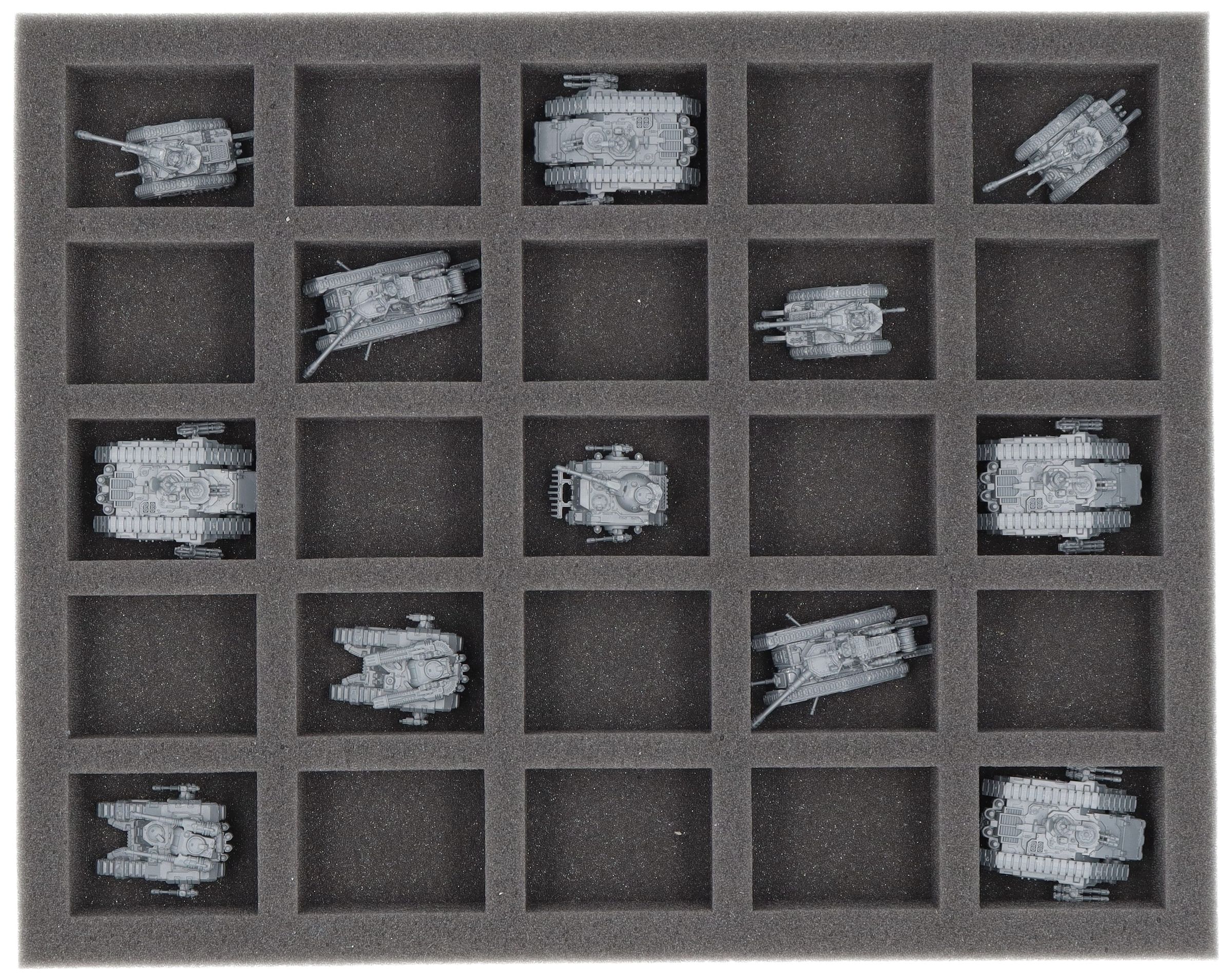- 2 Full-Size foam trays, each with 25 compartments for tanks like Spartan Assault Tank, Sicaran, Predator, Leman Russ, Malcador Battle Tanks and models with similar dimensions (FS040A036)