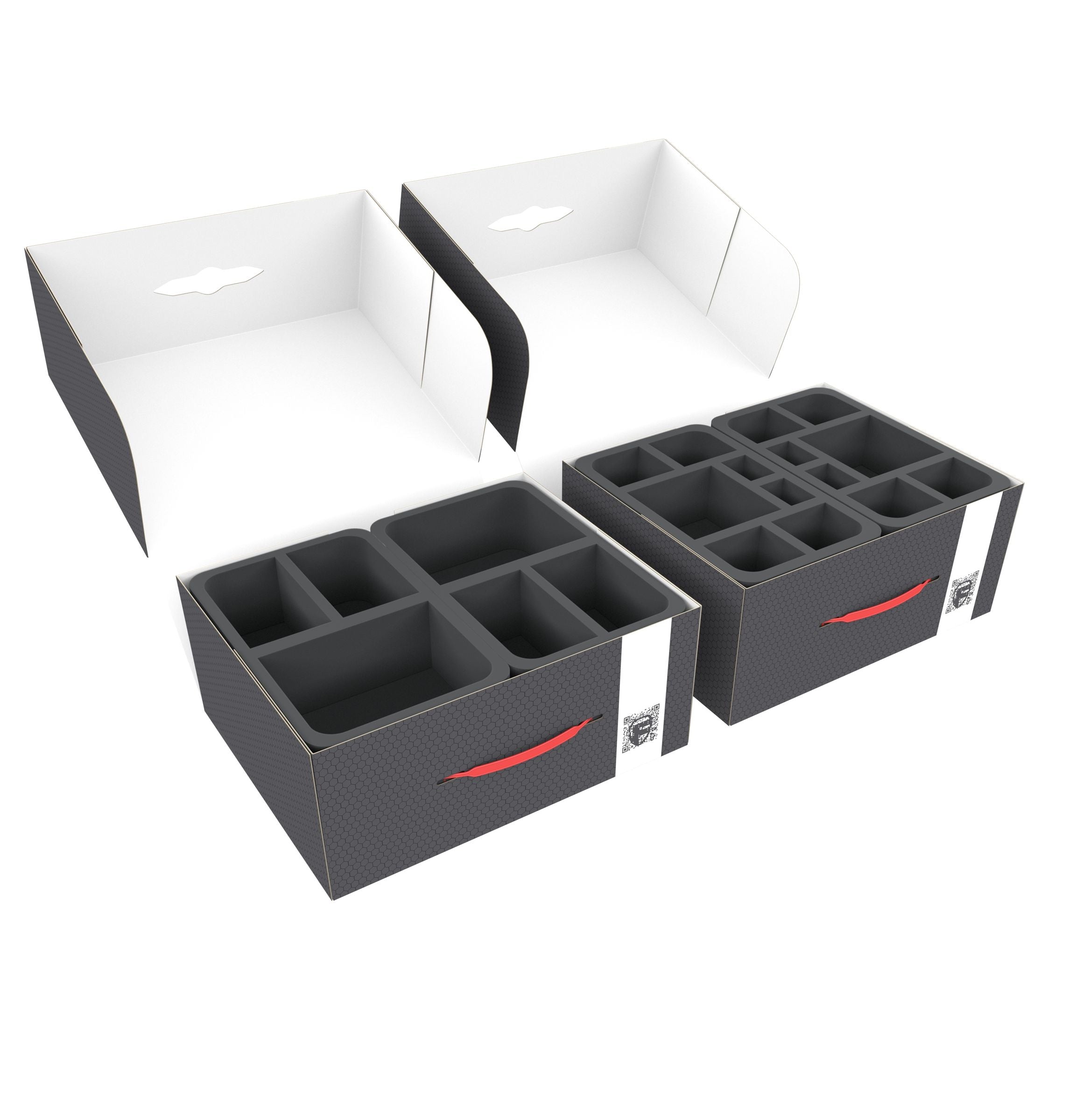 - 2 Half-Size foam trays with 3 compartments each for vehicle models such as Taurox-Prime, Leman Russ and miniatures with similar dimensions (HS080A007)
