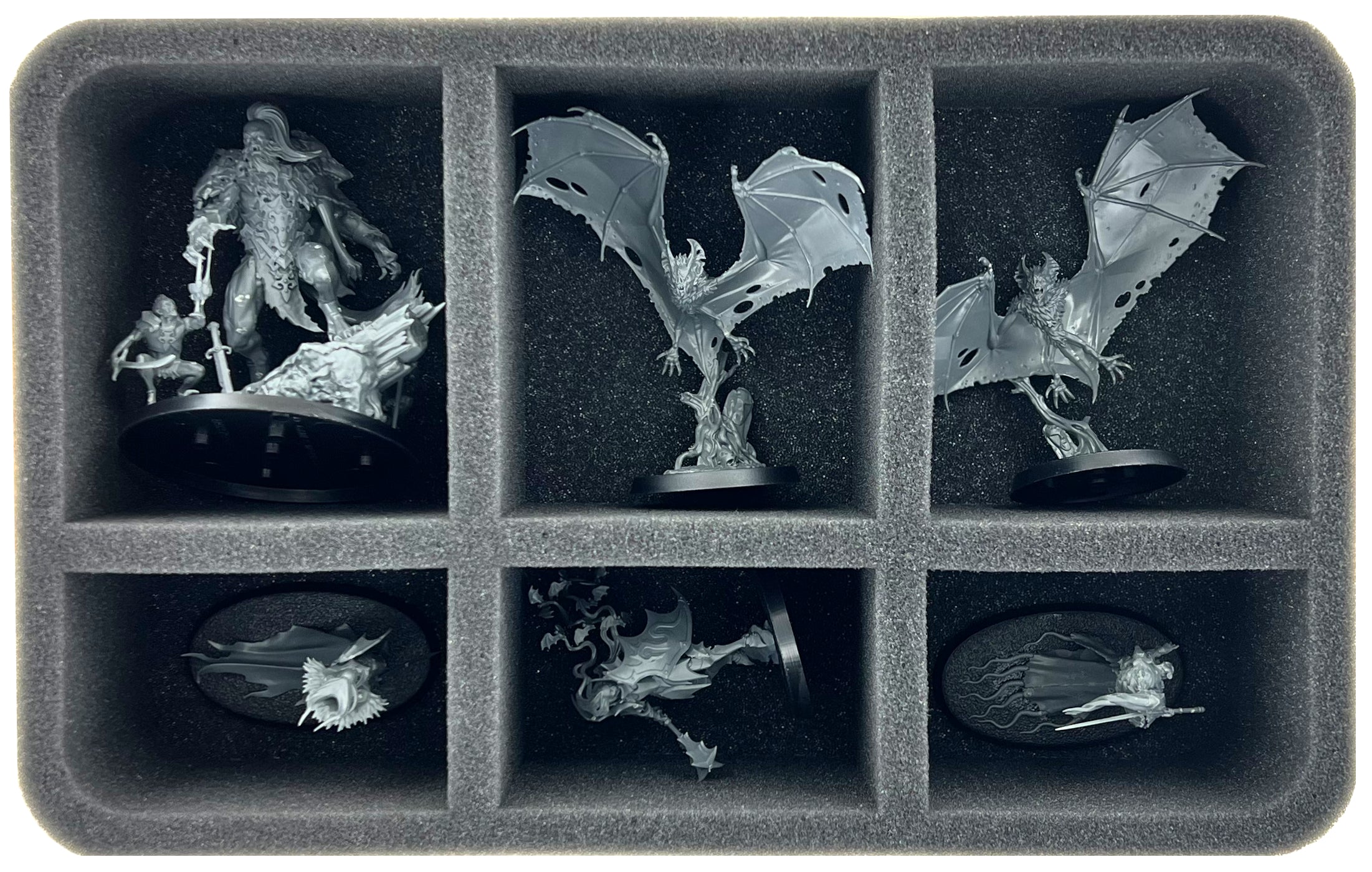 - 1 Half-Size foam tray with six compartments for medium-sized infantry like Glaurio ven Alten III, Torgillius the Chamberlain, Gorslav the Gravekeeper + models of similar size (HSMFAJ070BO)