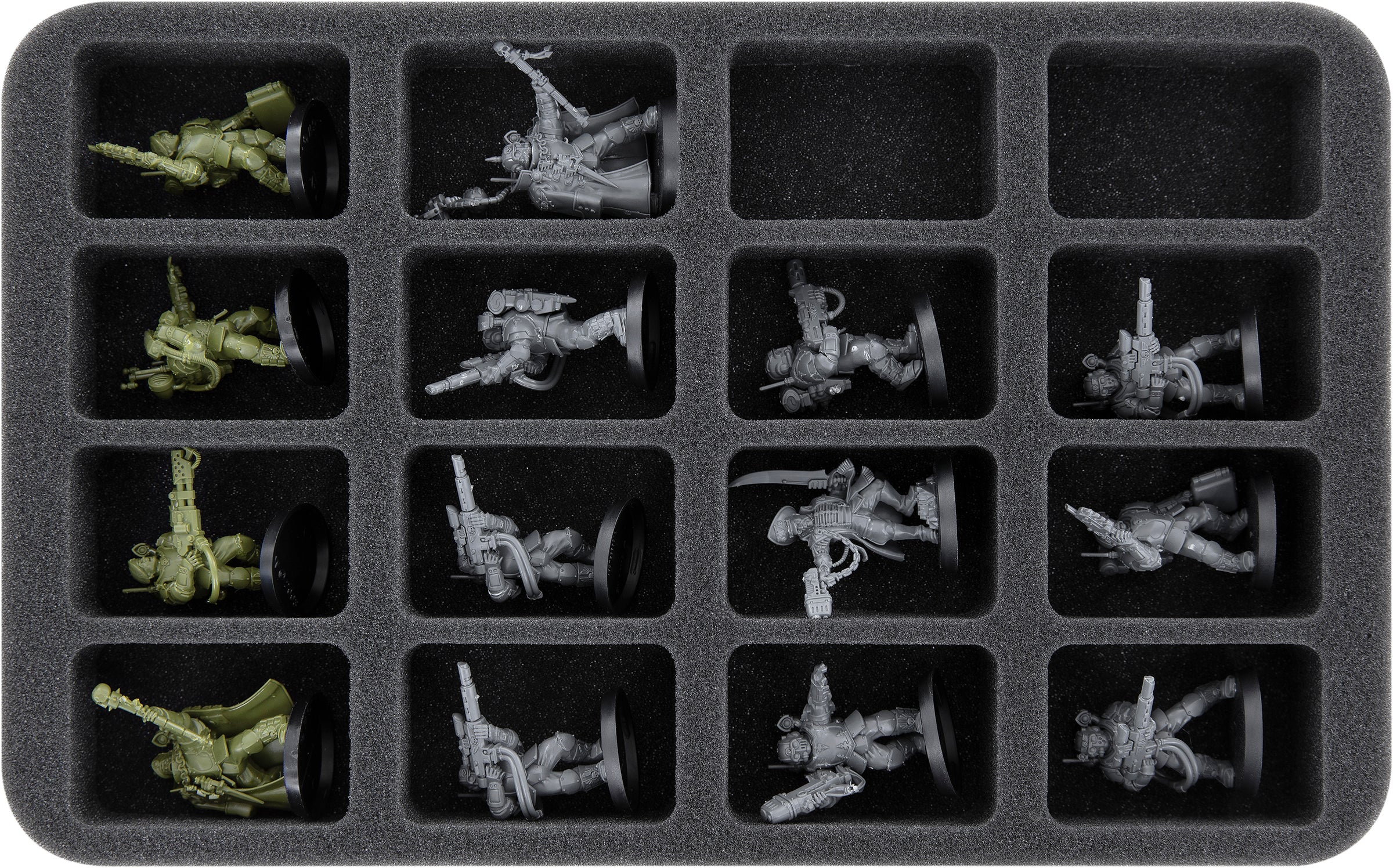 - 1 Half-Size foam tray with 16 compartments for standard infantry like Death Korps of Krieg and miniatures with similar dimensions (HS035A042)