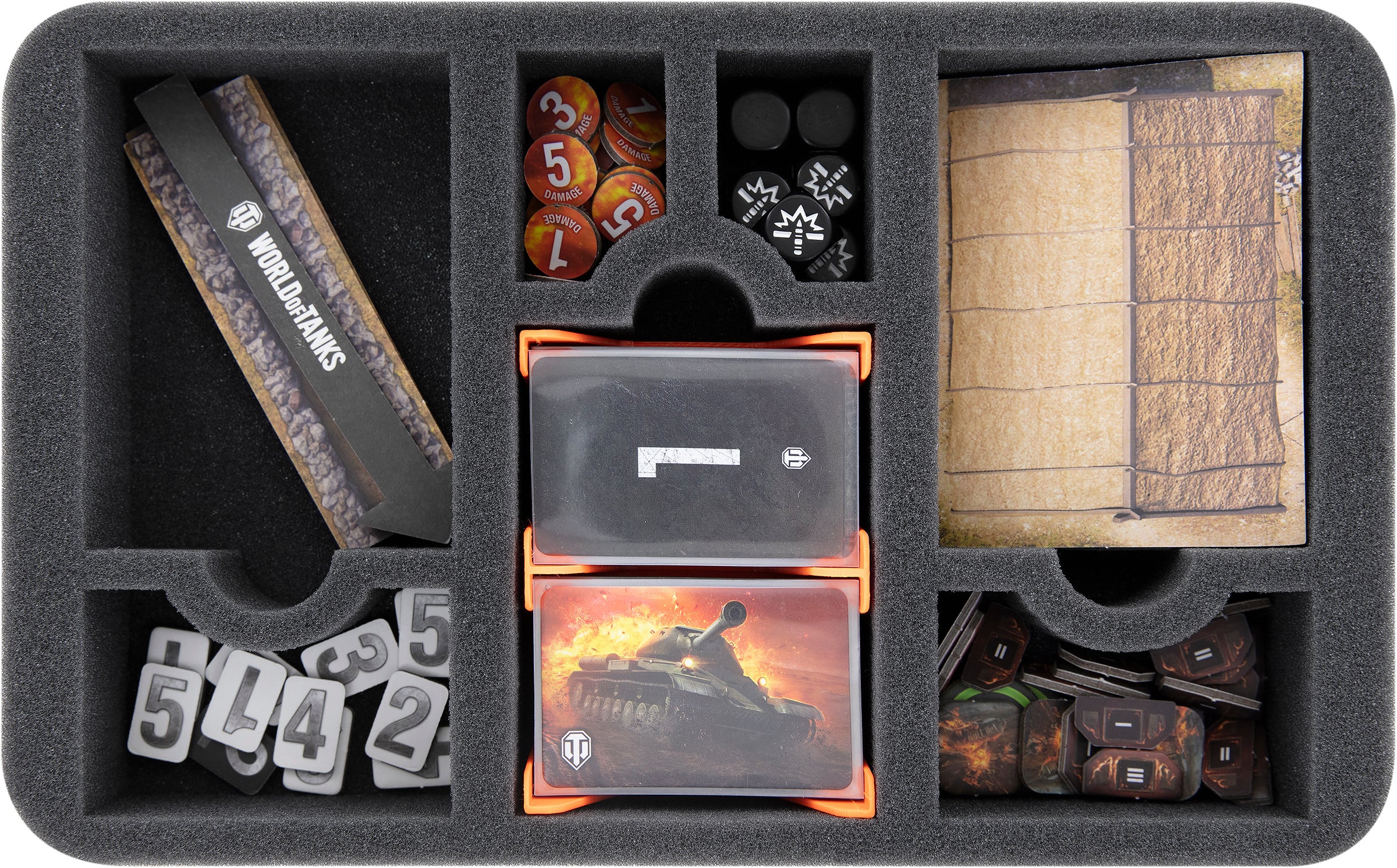 Two foam trays and a plastic card holder offer you space for your tanks, game materials, and cards. The soft foam reliably protects your models from damage. Precisely cut compartments prevent slipping around during transport. Your painted tanks are also protected from scratches and annoying paint abrasion.