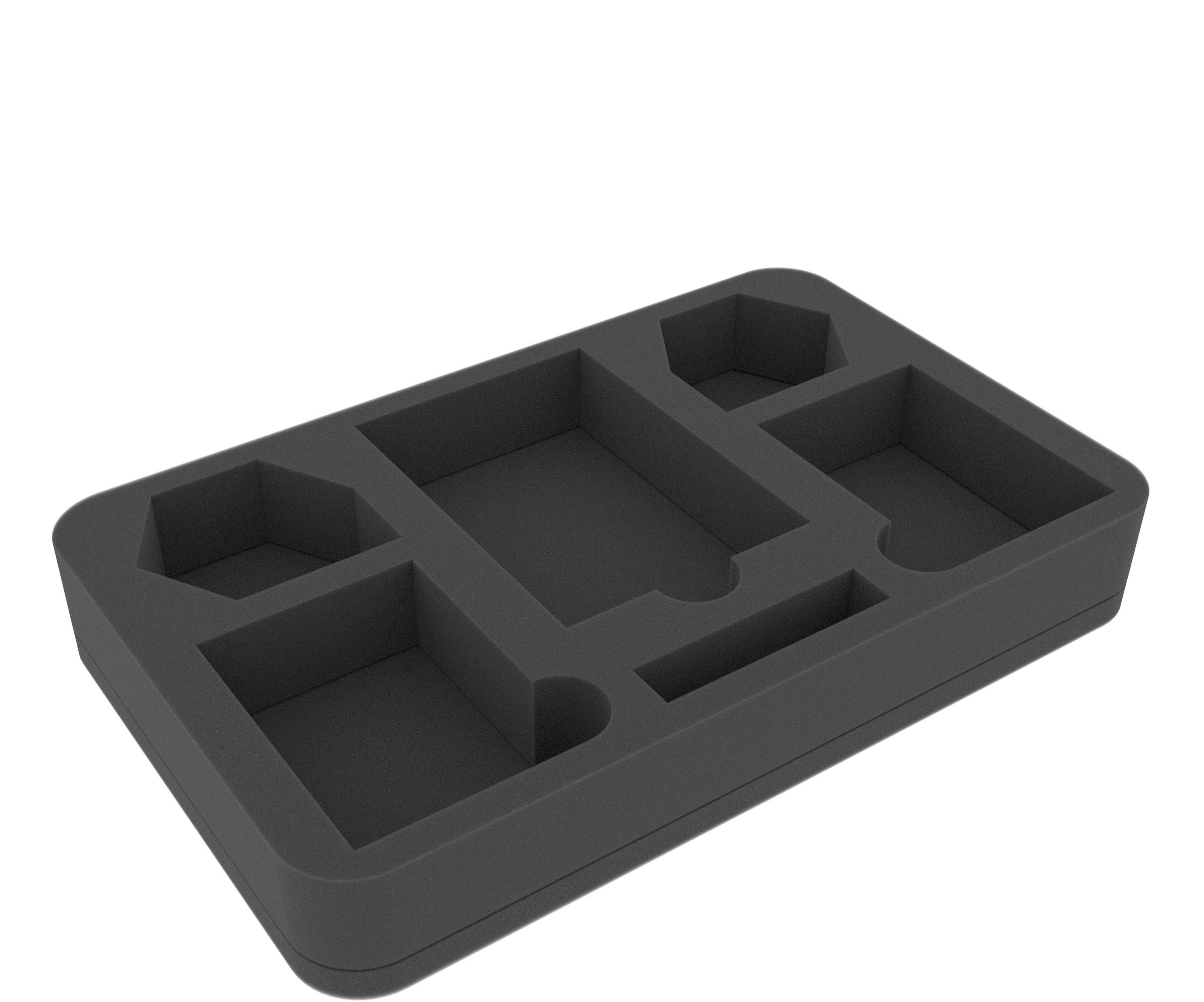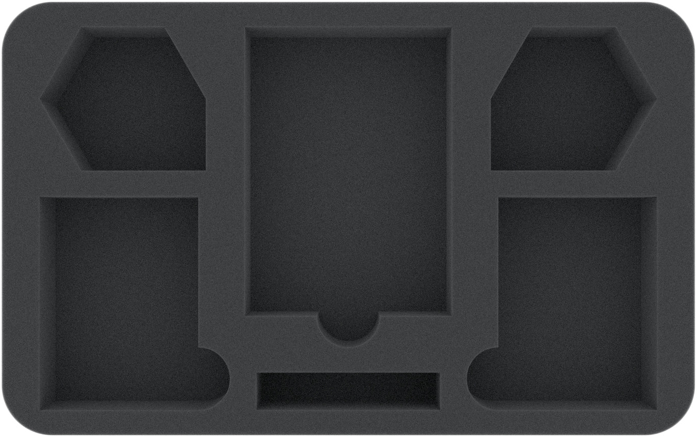 The 60 mm high foam tray (HSMEYV060BO) takes care of the miniatures and most of the game material. The two filigree models are placed in compartments cut exactly size of the miniatures. Thanks to the precisely fitting cut and the high-quality, soft foam, the sensitive details are optimally protected against breakage. Even the colors of the painted figures are protected from scratches and abrasion during transport.