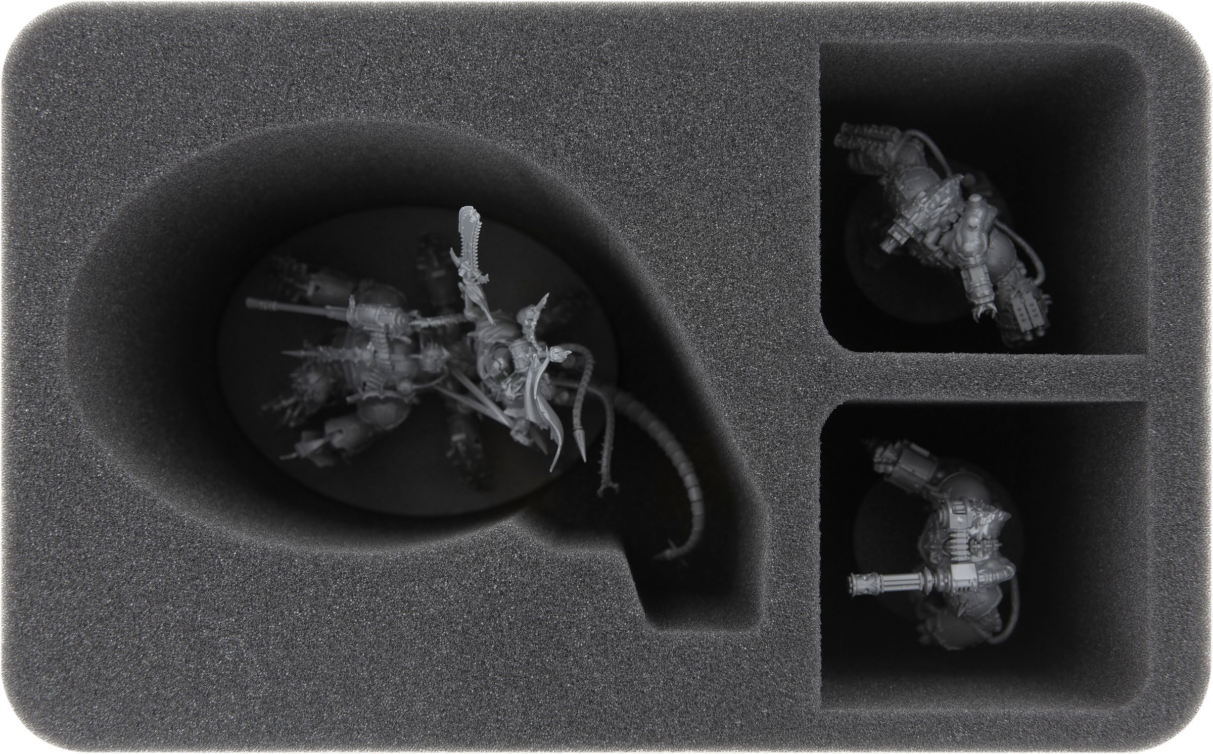 The foam tray for Vex Mechinator has three compartments – one large, custom compartment for the large miniatures as well as two further, small compartments for Obliterators, Havocs or character models.
