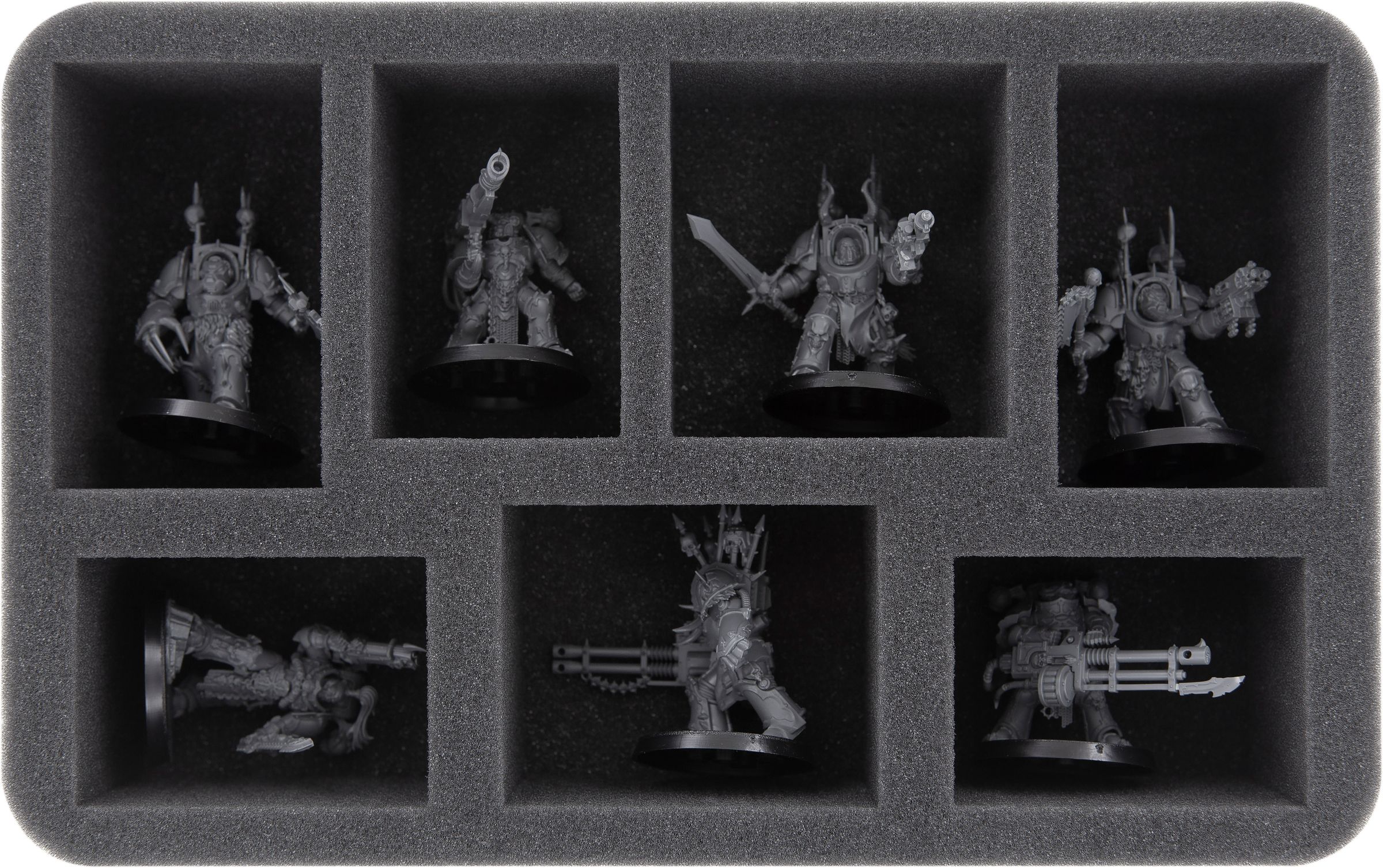The two HSCW075BO-trays have 12 compartments each. The two large compartments on each of the trays are suited for the Commander of the Black Legion Abaddon the Despoiler. The two medium-sized compartments of each of the two trays can be filled with e. g. Obliterators. The eight small compartments of both trays will hold standard warriors of the Heretic Astartes-Legion.