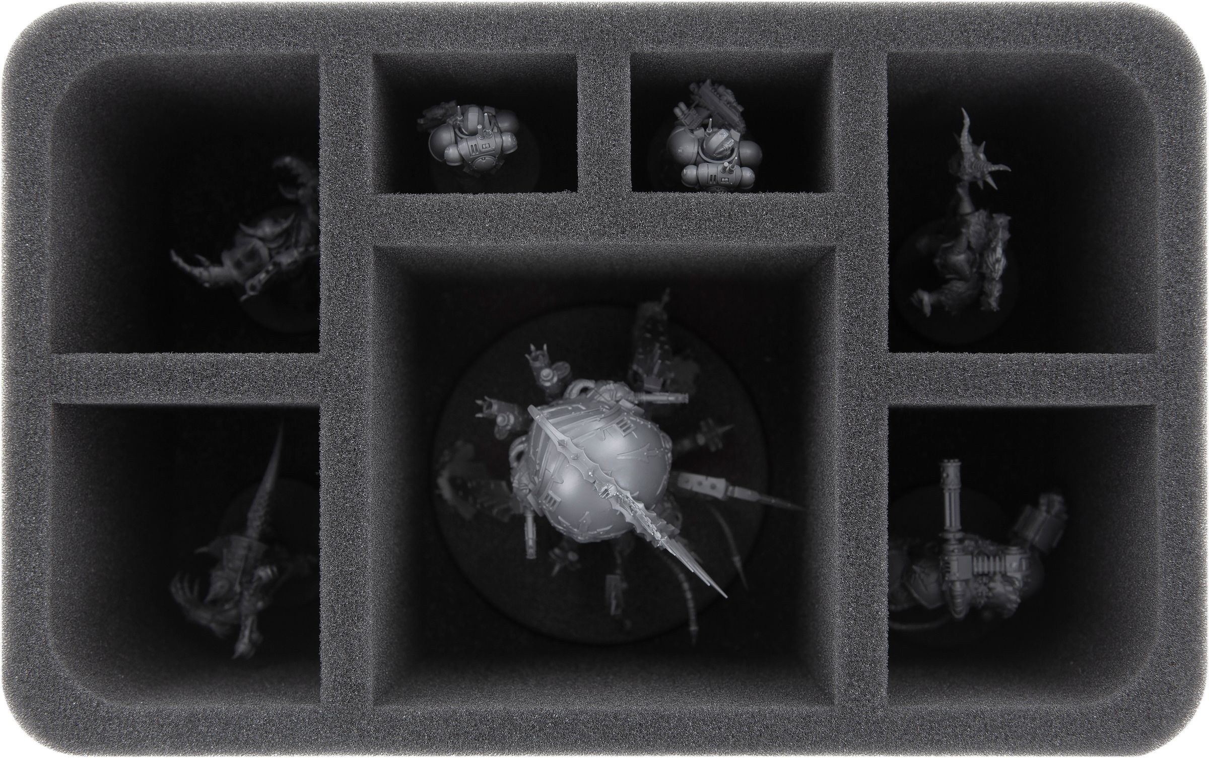 The two foam trays HSLZ060BO feature seven differently-sized compartments each and are especially suitable for bulky miniatures as e. g. Havocs or Terminators.