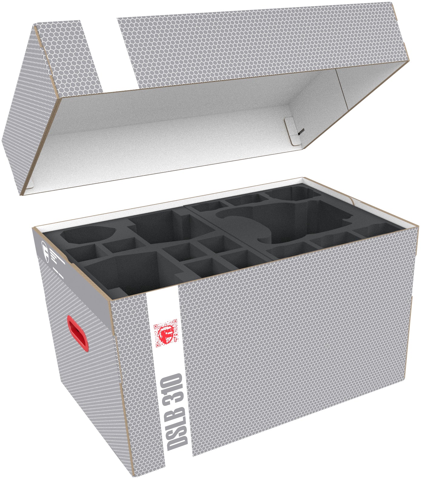 The storage box DSLB310 is made of coated, double-walled cardboard and is therefore both very light and very stable. The attachable lid reliably protects your miniatures from dust and other external influences. With the two plastic-reinforced carrying handles on the sides, you can transport the box very easily.