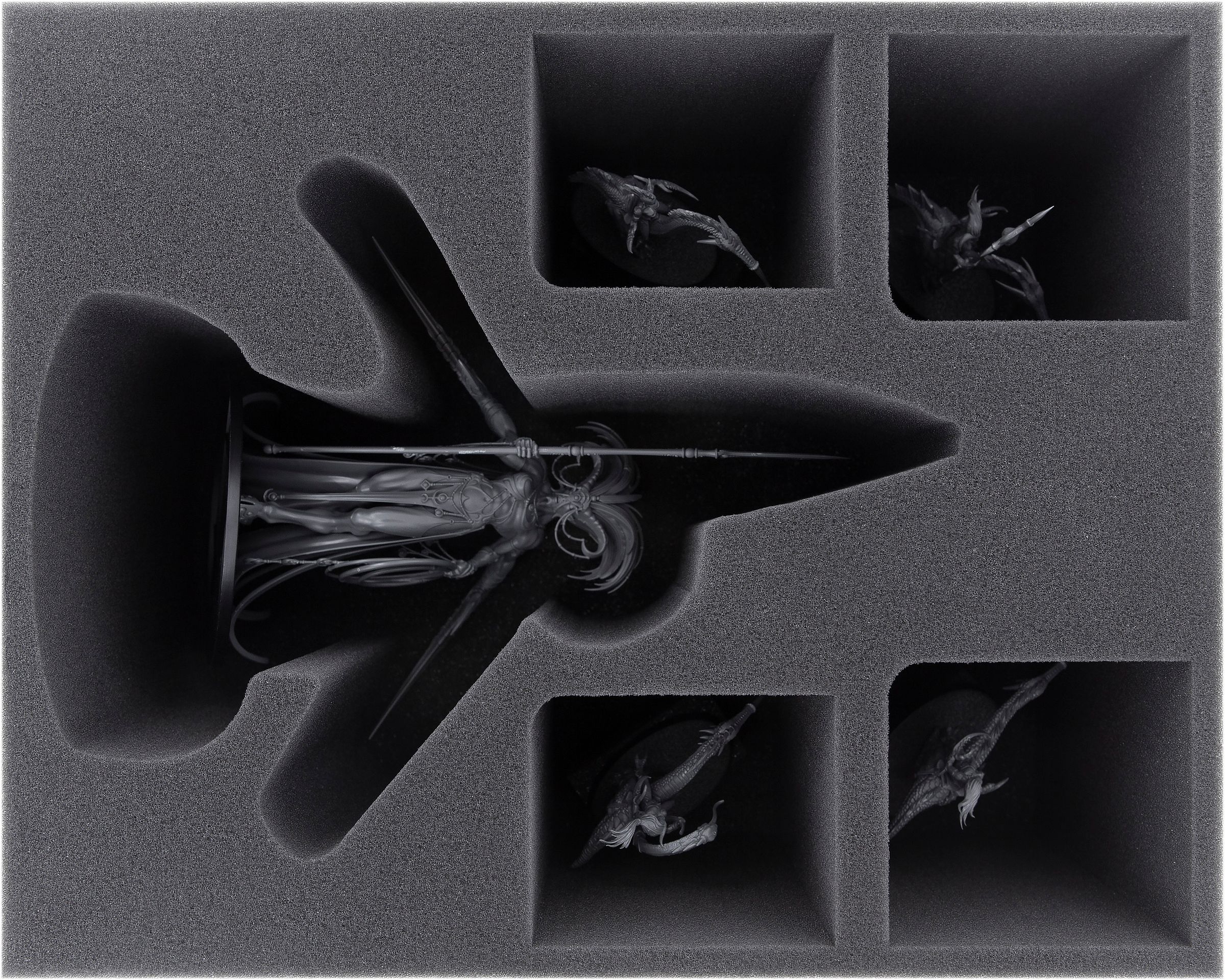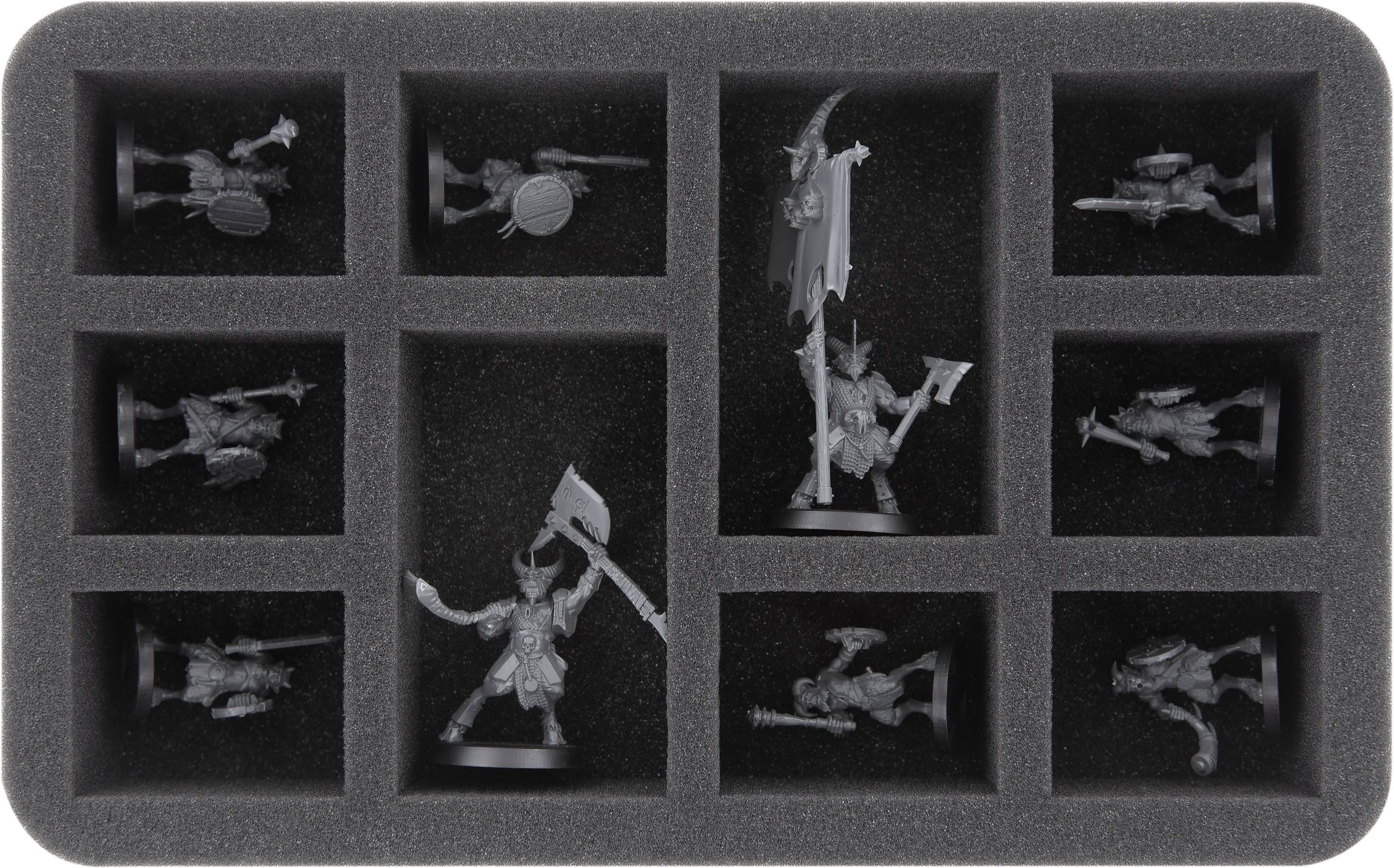 The tray FSMEOL100BO has a custom cut compartment for 1 model of Exalted Seeker Chariot. Three further compartments are suitable for miniatures like e. g. Fiends or Seekers of Slaanesh. The two small compartments will hold smaller miniatures like e. g. Masque.