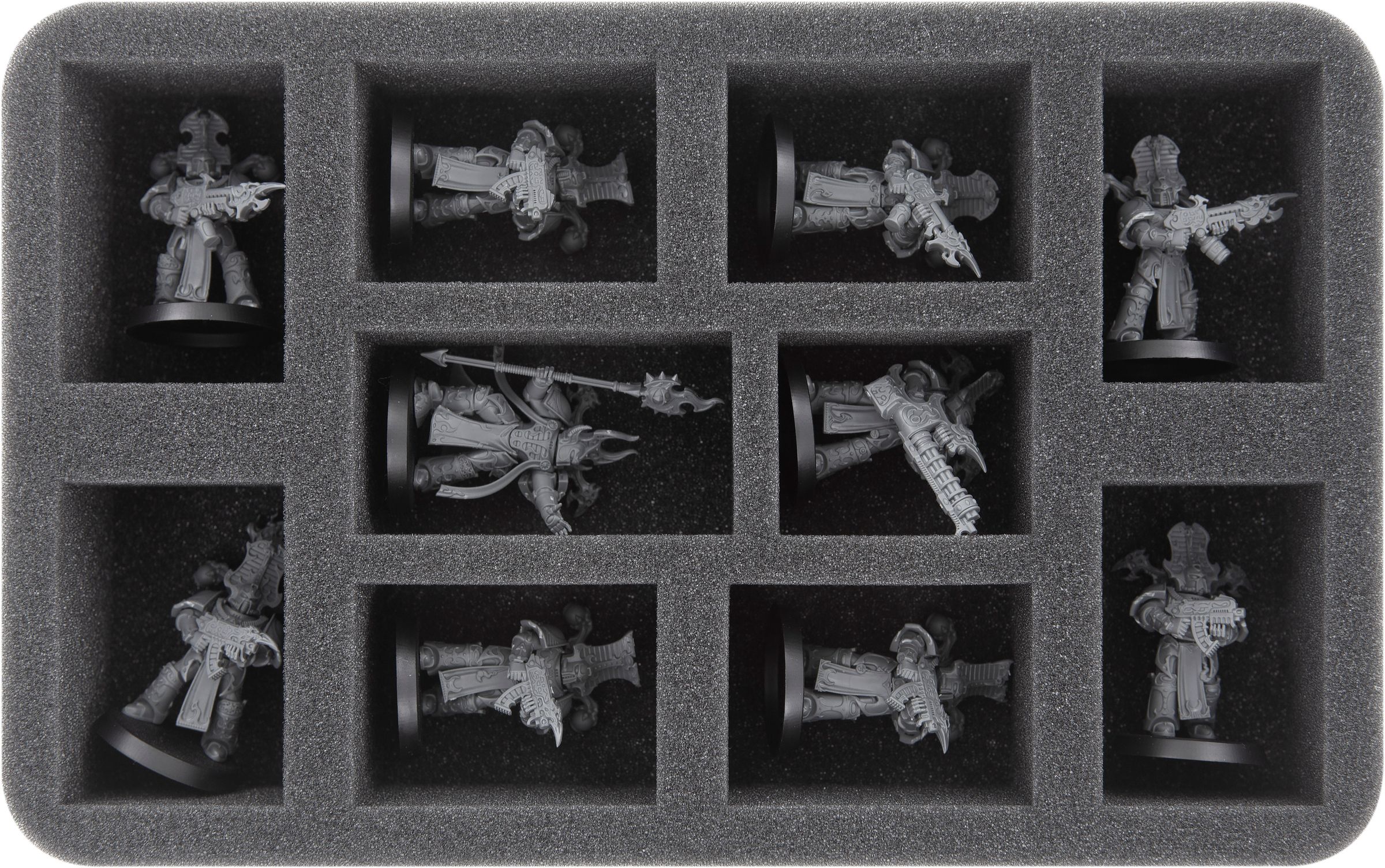 The 3 foam trays with 32 compartments each are suitable for standard-warrior-models on up to 32 mm bases, such as Rubric Marines. Each of the 32 compartments is 54 mm long x 35 mm wide x 40 mm deep.