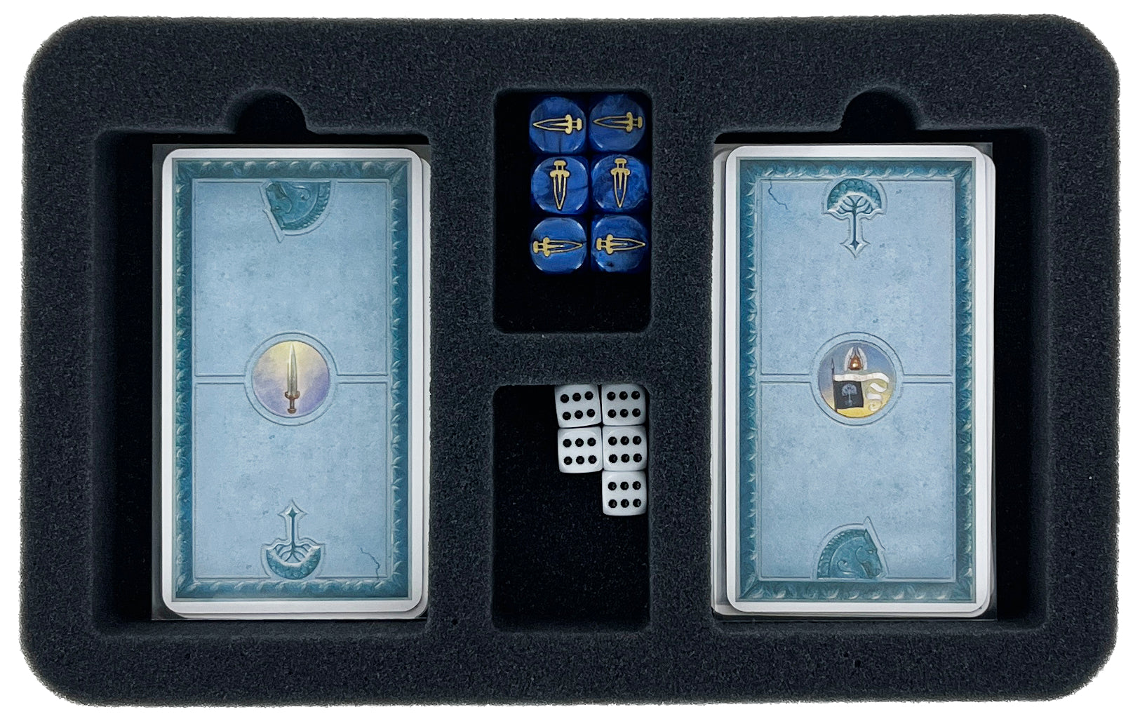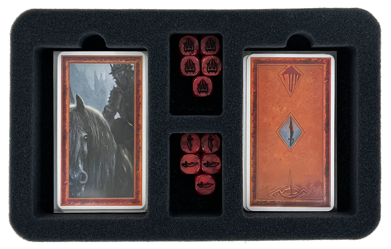 - 2 Half-Size foam trays, each with four compartments for game cards like companion cards (free peoples characters), Gollum card, minion cards (shadow characters), event cards + small-sized game material like dice, tiles, and markers (HSMENZ040BO) li>