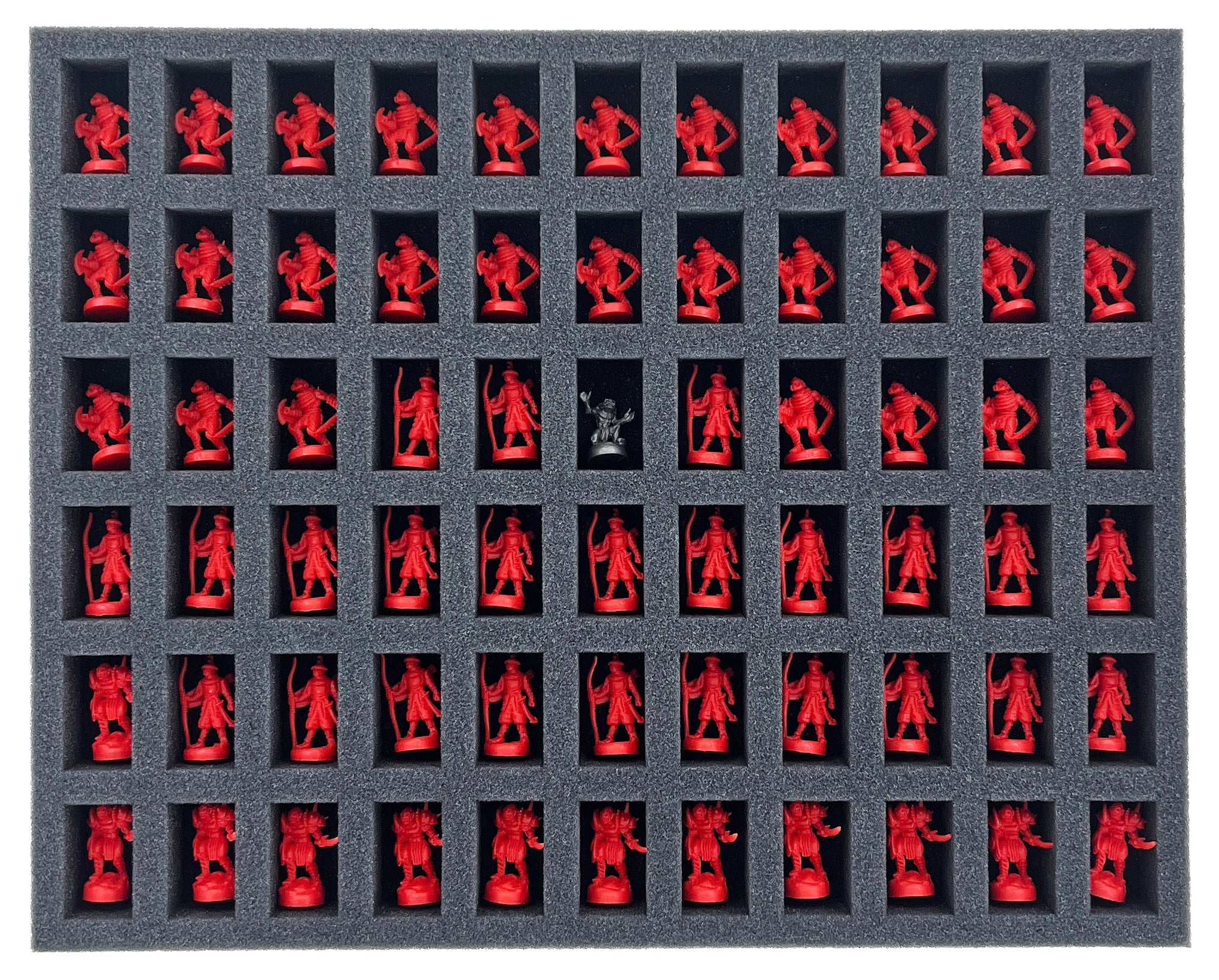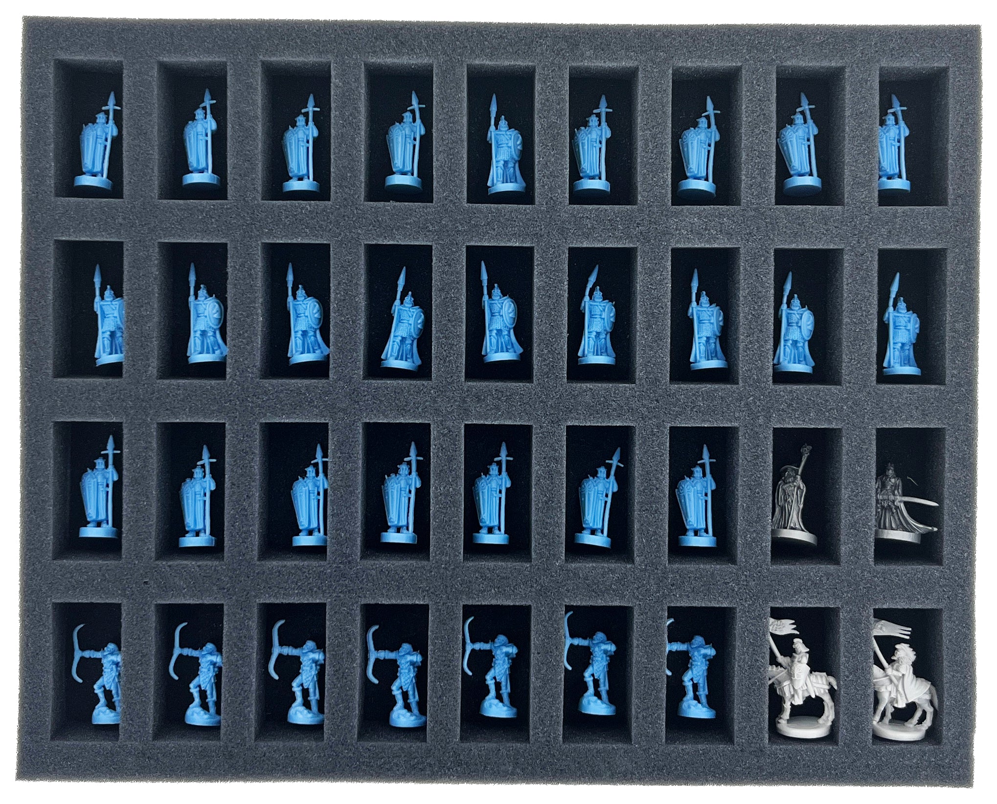 - 1 Full-Size foam tray with 36 compartments for infantry and cavalry units + villain models like Saruman, the Witch-king, Mouth of Sauron + Nazgul + small-sized game material (FS050BO)