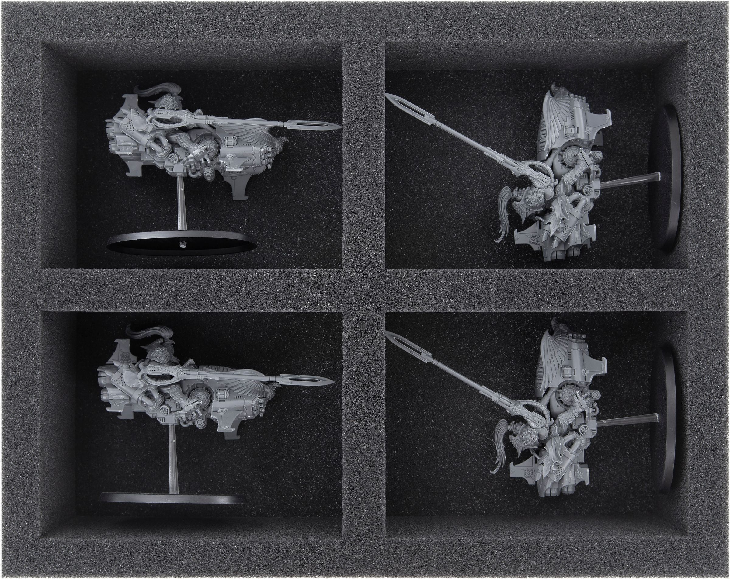 To prevent broken lances from your Vertus Praetors, stow your golden warriors in the inserts with four compartments each. The generously sized compartments leave enough room for bulky models, like a Shield Captain with a raised lance.