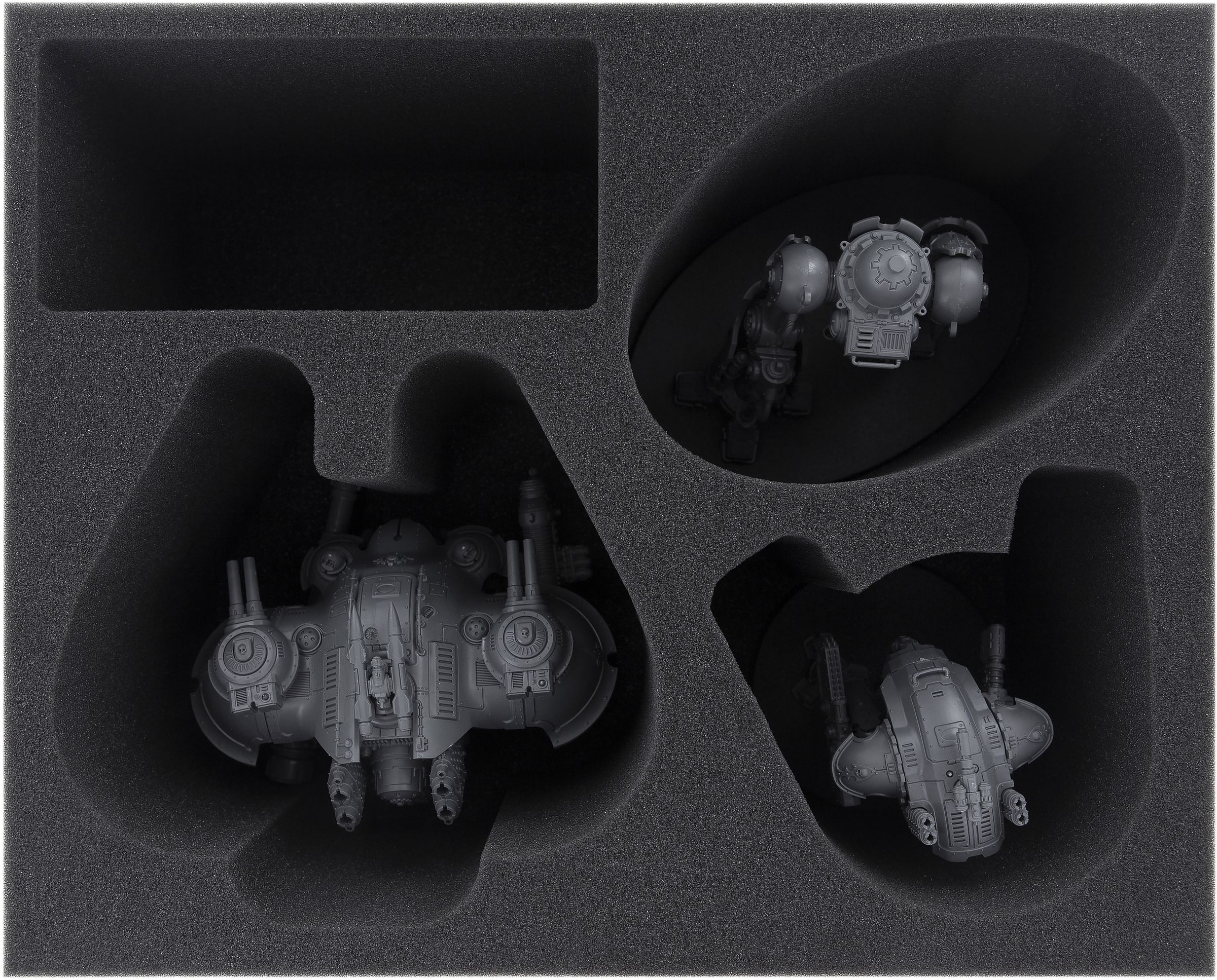 The four trays are each divided into four custom-cut compartments. Both a large Knight from the Dominus class (e.g. Knight Castellan or Knight Valiant) and his smaller brothers from the Questoris class (e.g. Knight Warden or Canis Rex) can be safely stored here in two parts - upper part with weapon unit and the lower part with barrel unit. Surrounded by foam, the sensitive parts of the miniature are well protected, even during transport.