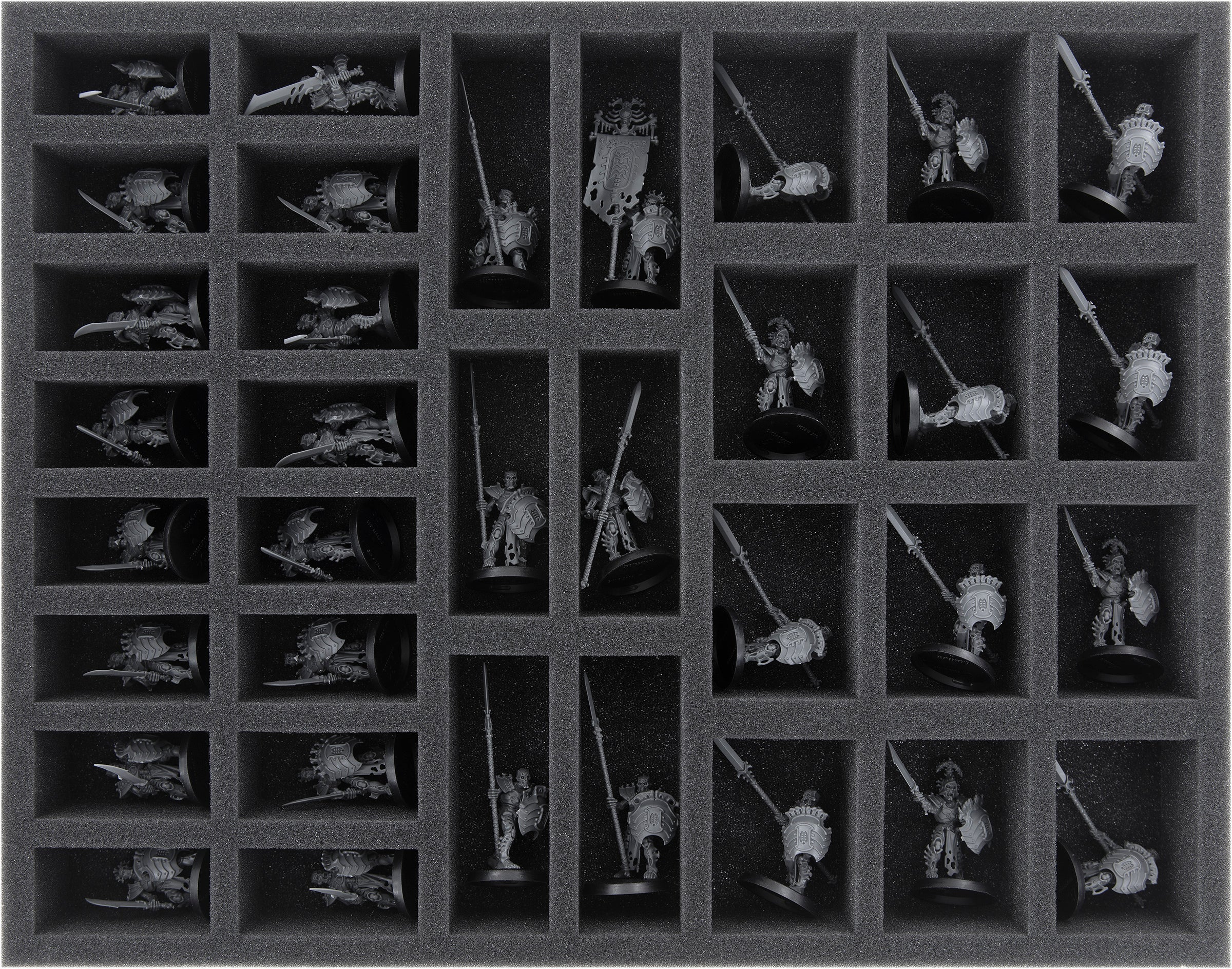 - 2 Full-Size foam trays, each with 34 compartments for standard infantry on 25 mm bases, e.g. Skeleton Warriors, Grave Guard (FS040A027)