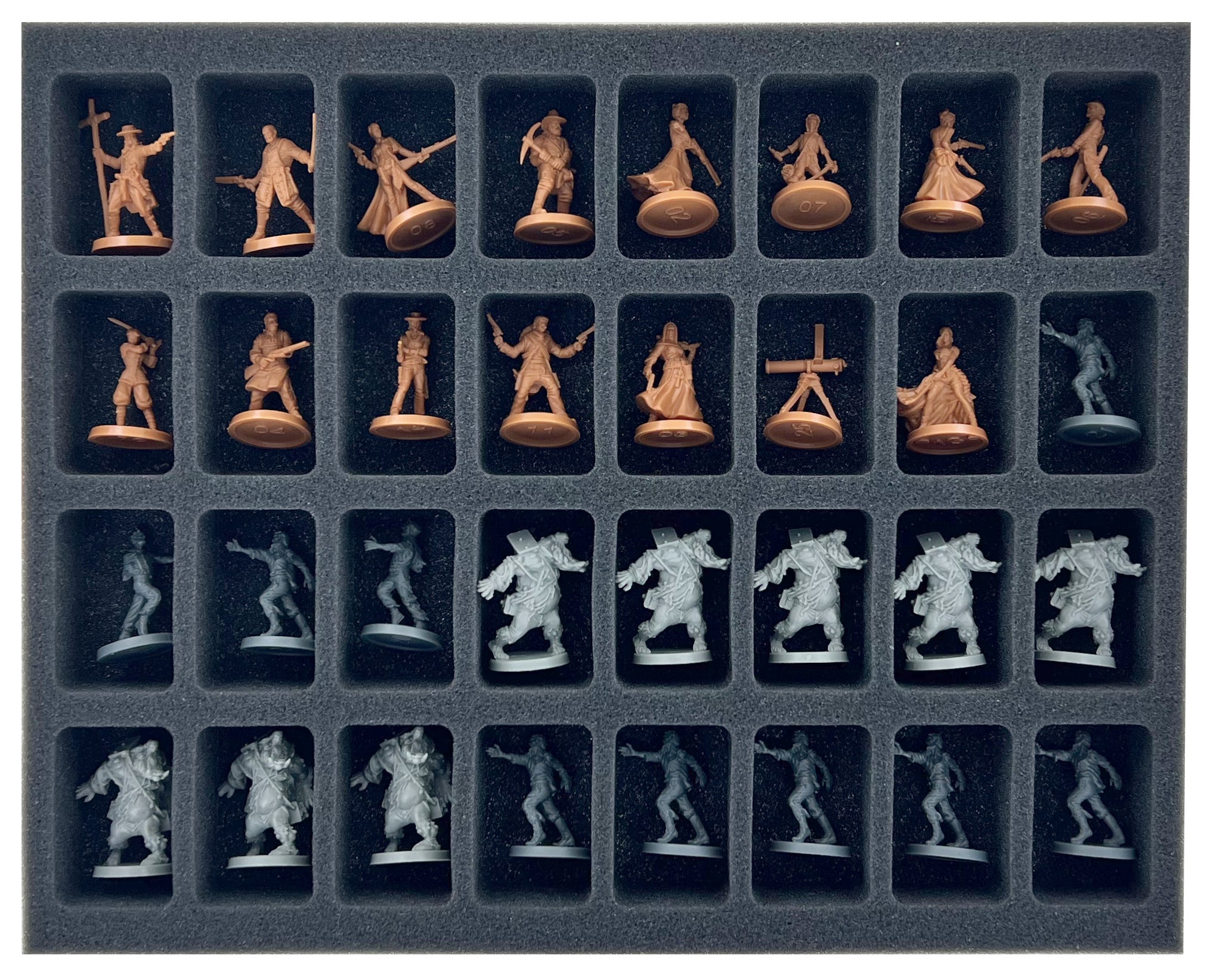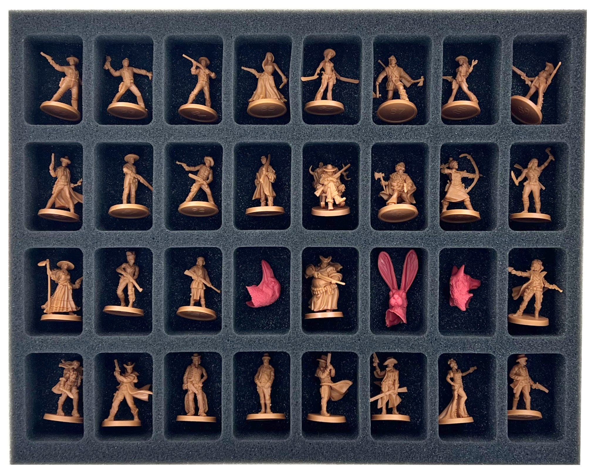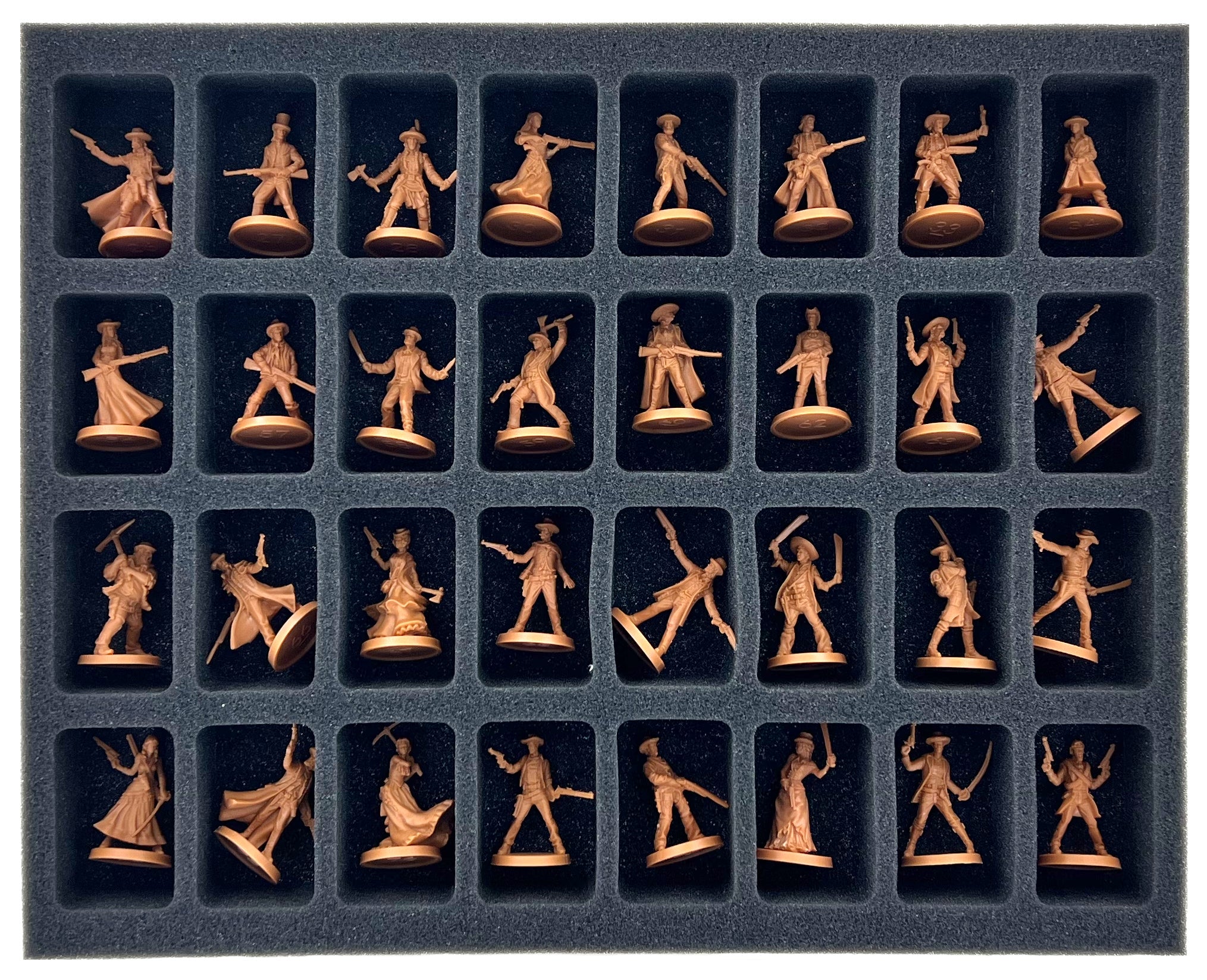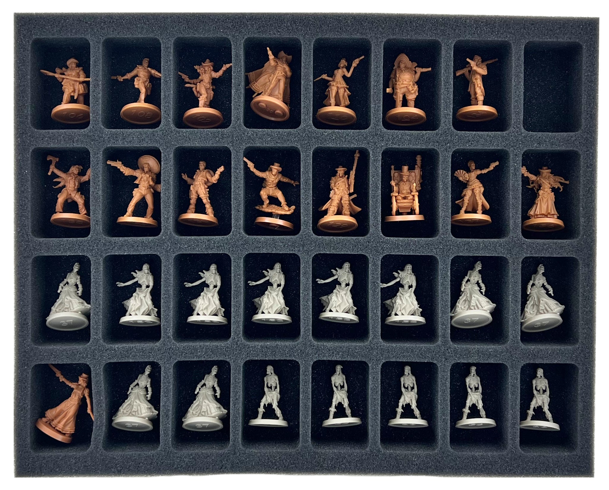 - 6 Full-Size foam trays, each with 32 compartments for standard miniatures like Billy the Kid, Dotty, Gunslinger Walker, and miniatures with similar dimensions (FSMEDS040BO)
