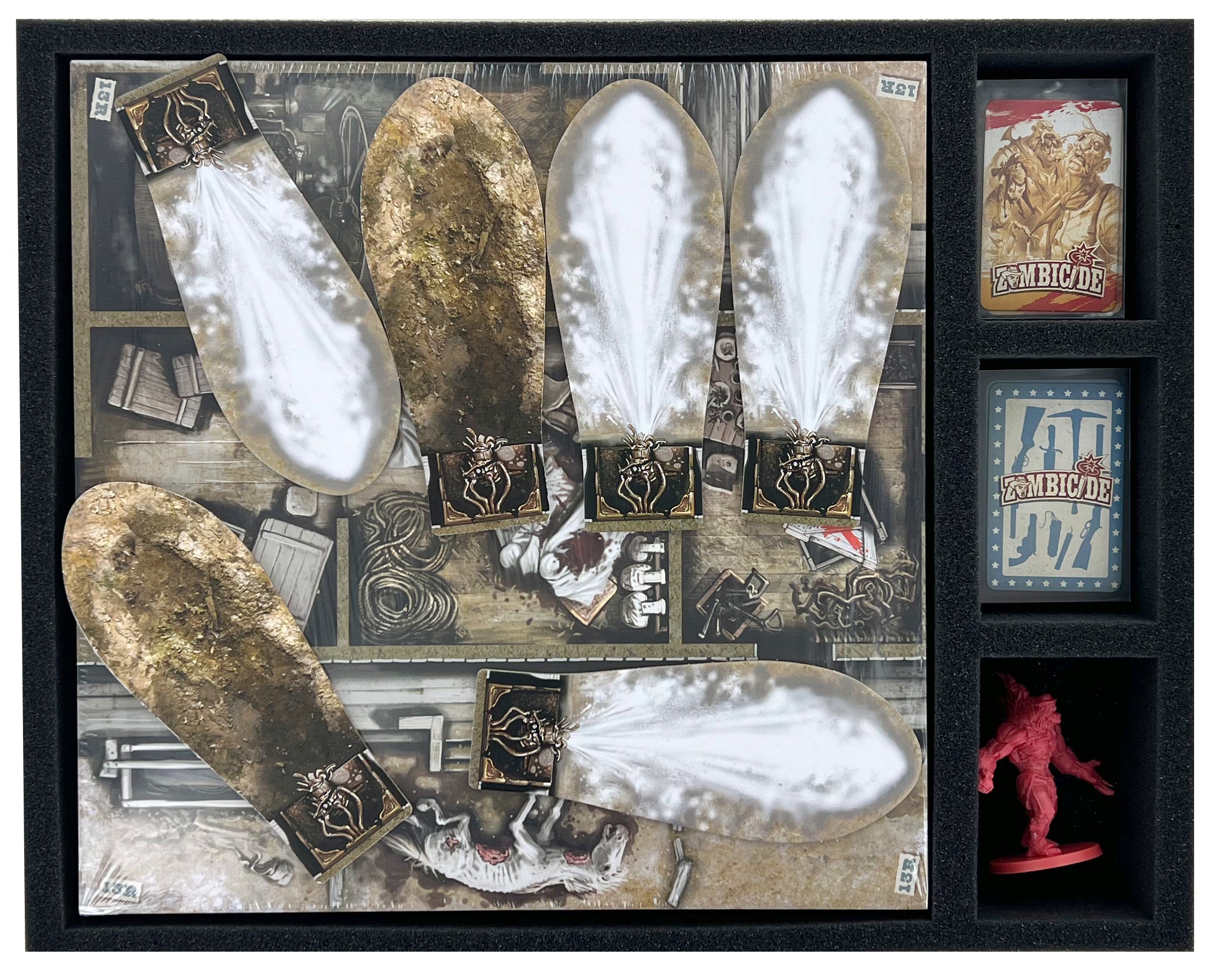 - 3 Full-Size foam trays, each with four compartments for game material such as survivor dashboards, campaign sheet notepad, survivor base rings, double-sided game tiles, dice, steam gauge, train tiles, trackers, tokens + small-format playing cards such as equipment cards, Reference Cards, Zombie Cards, Subscription Card + larger miniatures such as subscriptions and miniatures of similar dimensions + plastic token and card holder (FS050I031BO)