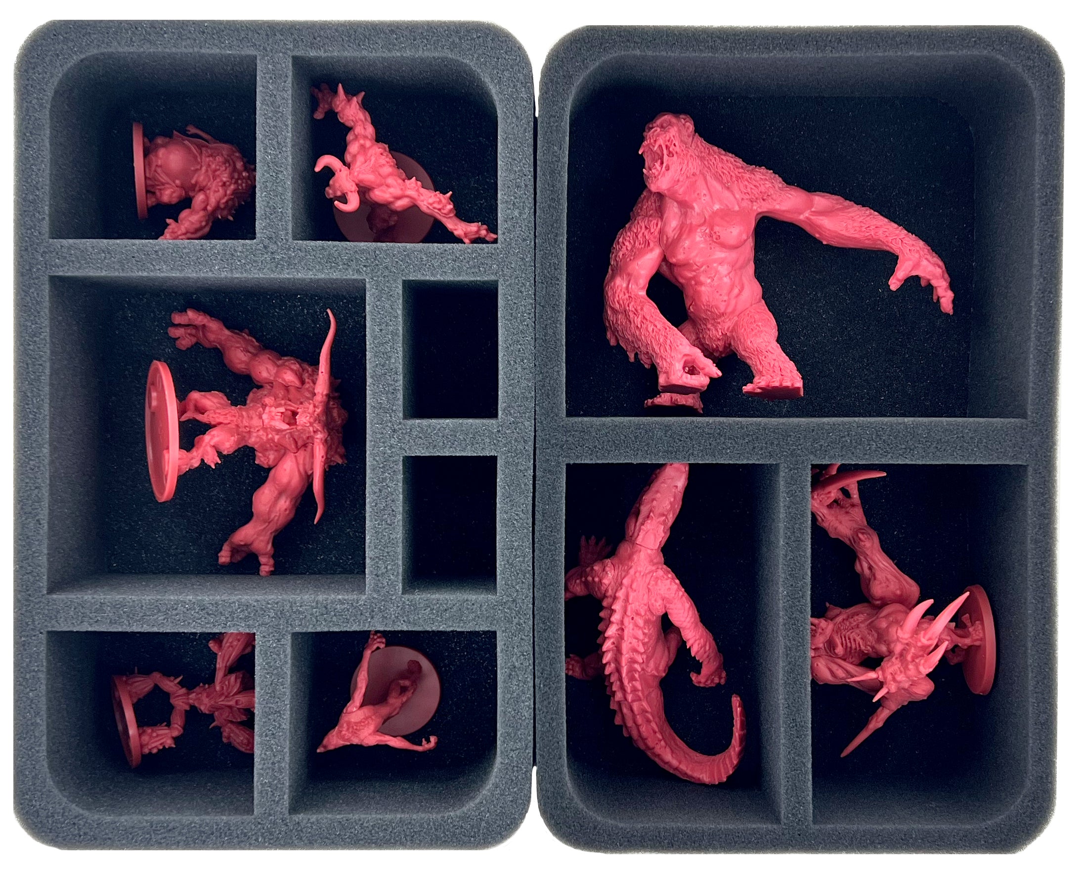 - 1 Half-Size foam tray with five compartments for huge miniatures like the Wendigo + large miniatures like Alpha Bane, Fat Mace, Gore Geyser, Deathgrasp, and miniatures with similar dimensions (HSMEVL090BO)