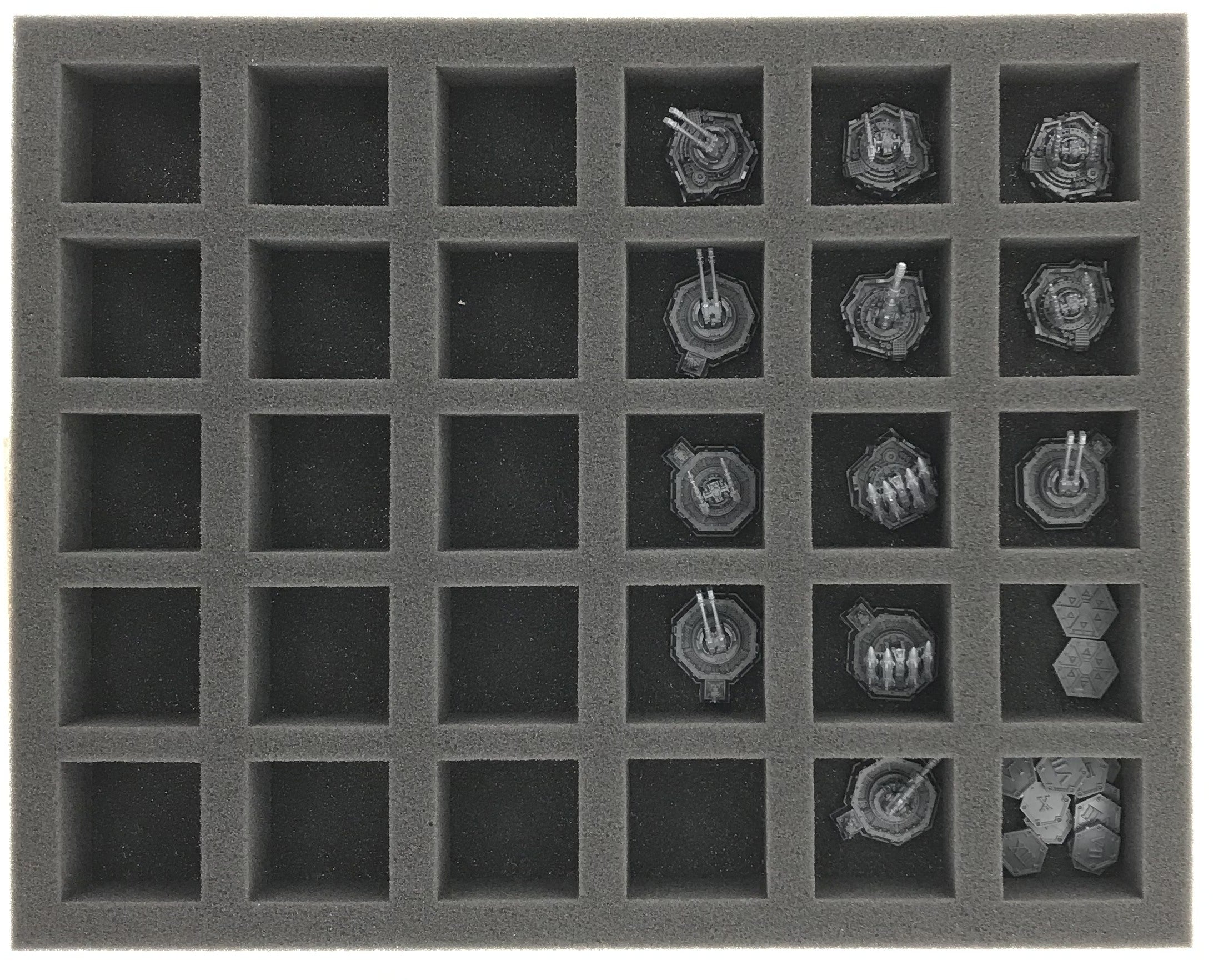 The Full-Size foam tray with 30 same-sized compartments allows you to store the ground assets of your Imperial Navy neatly separated from each other. The compartments are custom-fit for the Manticore Missile Batteries, Hydra Flak Batteries, Imperial bunkers, and the Flak Platforms.