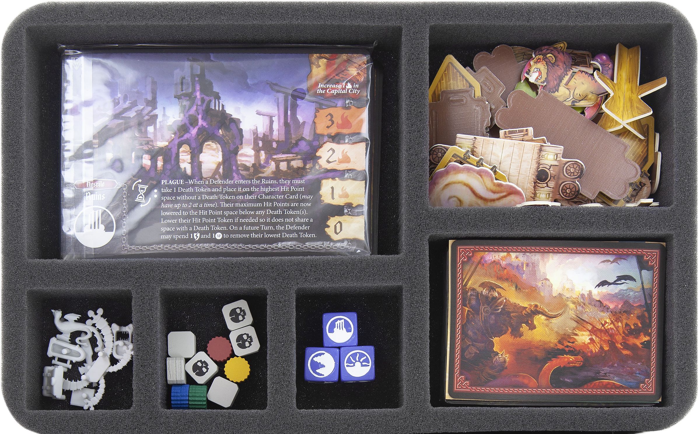 The 2 foam trays of the set are identical – 1 tray is reserved for the contents of the base game, 1 tray will hold the contents of the expansion. This way, the game components do not get mixed up.