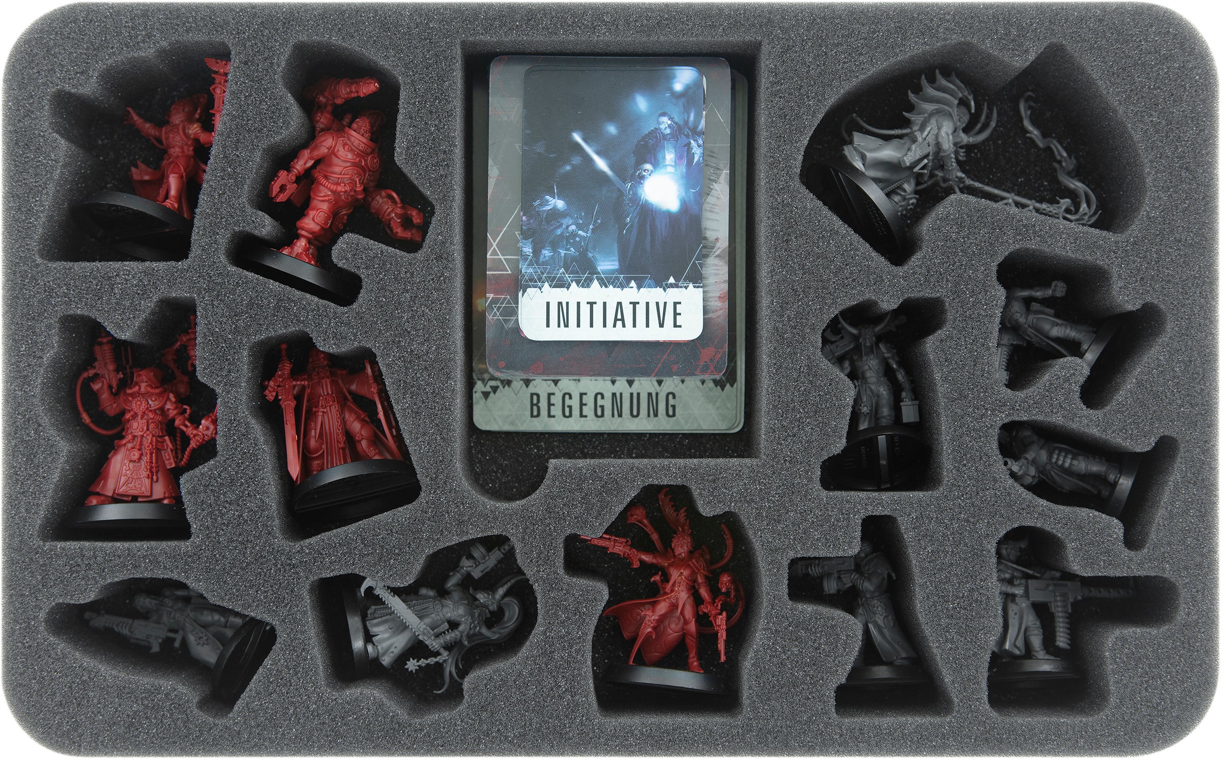Explorer, hostile or retinue - each model is treated equally well on this insert. The 13 filigree miniatures are safely surrounded by high-quality foam in miniature-precise cut compartments. Thanks to the exact cut not only the sensitive parts, such as the Hellfire torch or the feathers headdress of the Rogue Trader, are optimally protected against damage. The colors of the painted figures are also protected from scratches and abrasion.
