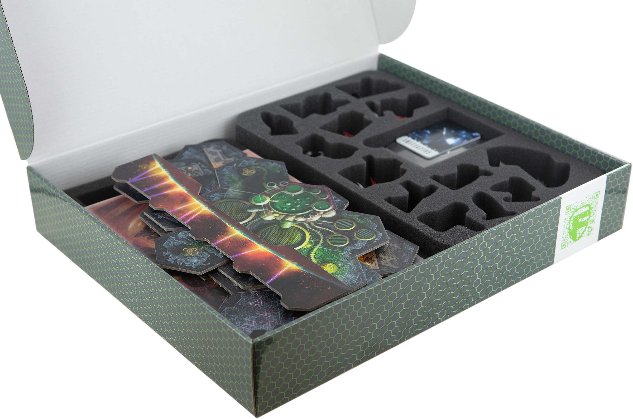 A second foam tray is included in the package for the proper storage of the remaining game material. It has four compartments to neatly store the tiles as well as the tokens. The larger game components - large cards (e.g. Initiative Cards), large tiles and cardboard parts, Throne of Mallex envelope and the stasis chambers - are placed upon the mat.