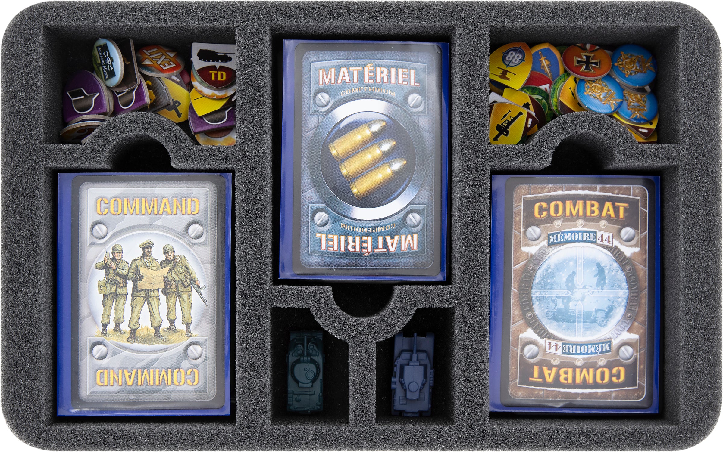 - 1 Half-Size foam tray with 11 compartments + 4 plastic token holders for hex tiles, dice, tokens, sandbags, and bunkers/bridges (HSMERN040BO + 60256)