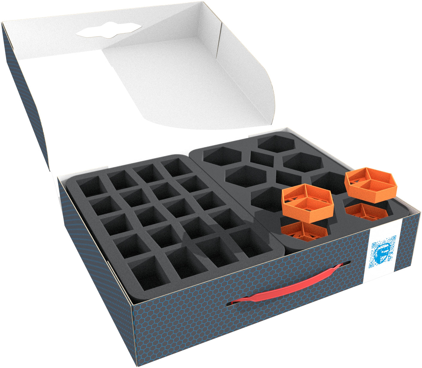 - 1 Half-Size foam tray with 11 compartments for e.g., hex fields, token, dice sand bags, bunkers, bridges (HSMERN040BO)