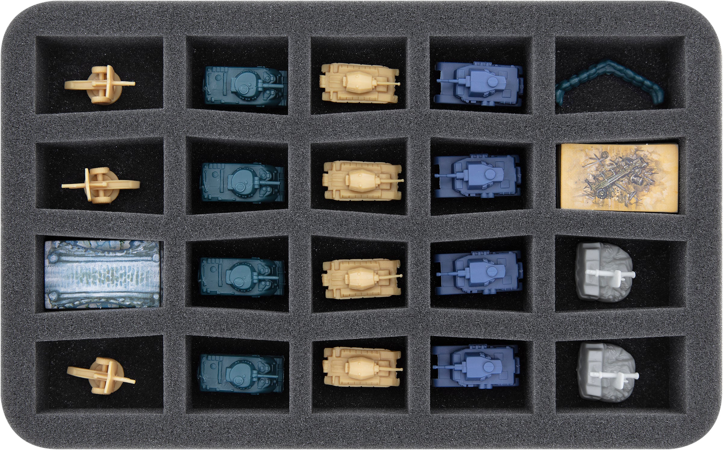 - 1 Half-Size foam tray with 20 compartments for e.g., tanks, sand bags, bunkers, bridges, anti-tank-gun, field bunkers, road blocks, artillery (HS035C5BO)