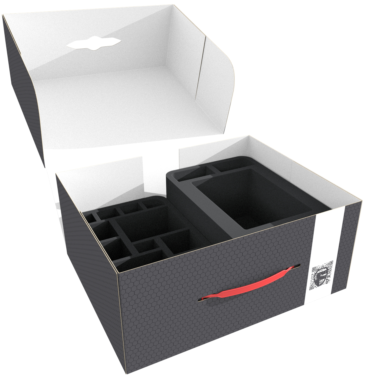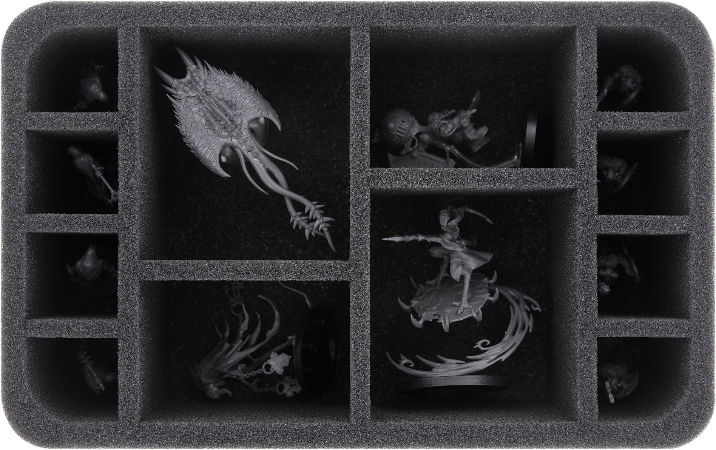 We have packed four Half-Size foam trays into the sturdy box to protect your miniatures. Whether Daemon Prince or the Changeling, each model gets its own compartment. The custom-fit cut ensures that the models sit firmly and the figures do not slip even when transported through the Warp. The high-quality foam ensures that details are well protected. The colors of your units are also preserved, and the soft foam ensures that your figures are safe from ugly scratches and color abrasion.