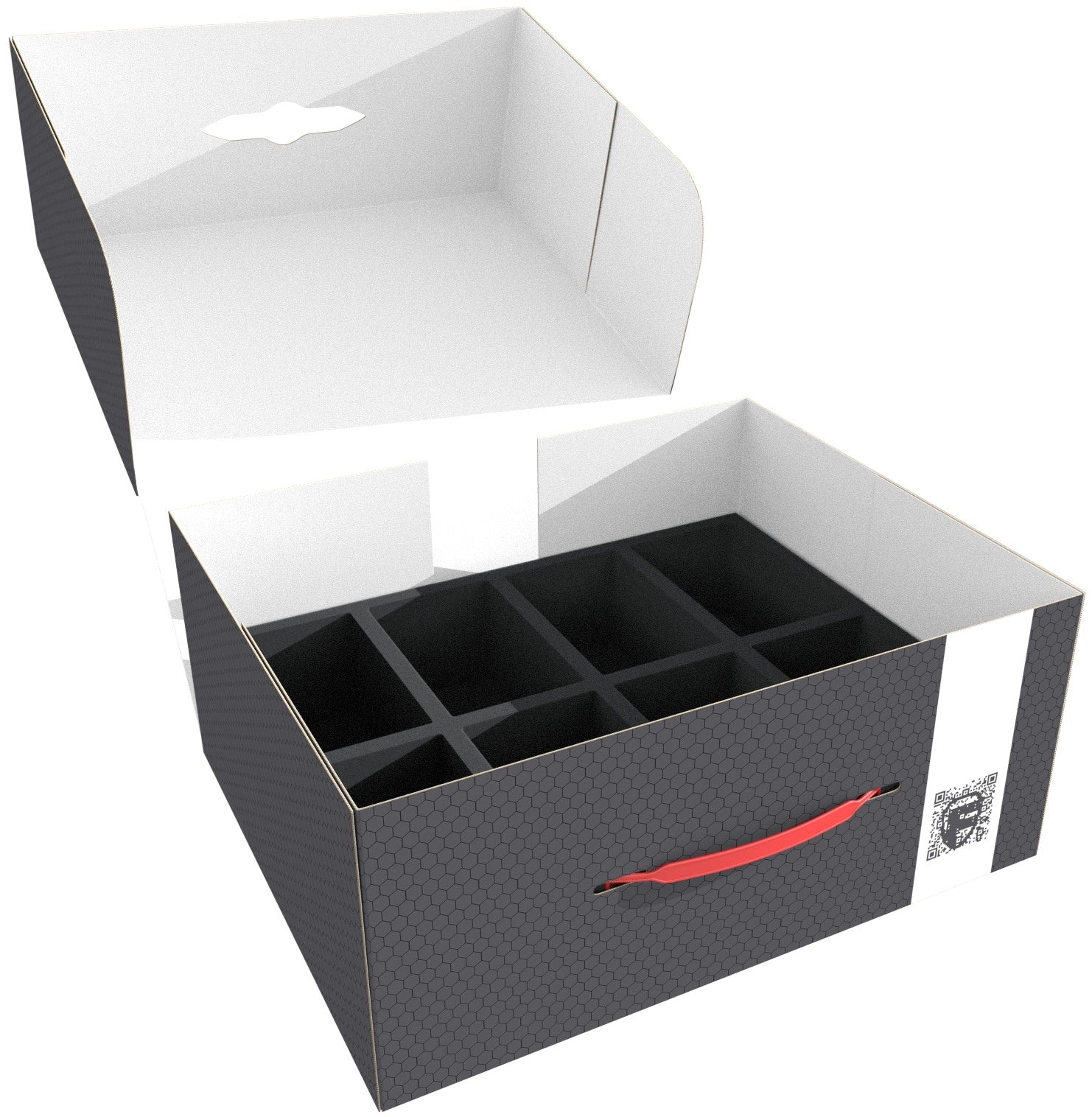The FSLB150 is made of coated, double-walled cardboard. This makes it not only pleasantly light, but also particularly tear-resistant and stable. With the matching foam trays, miniatures and game material can be stored safely and dust-protected and can also be transported effortlessly with the plastic carrying handle.