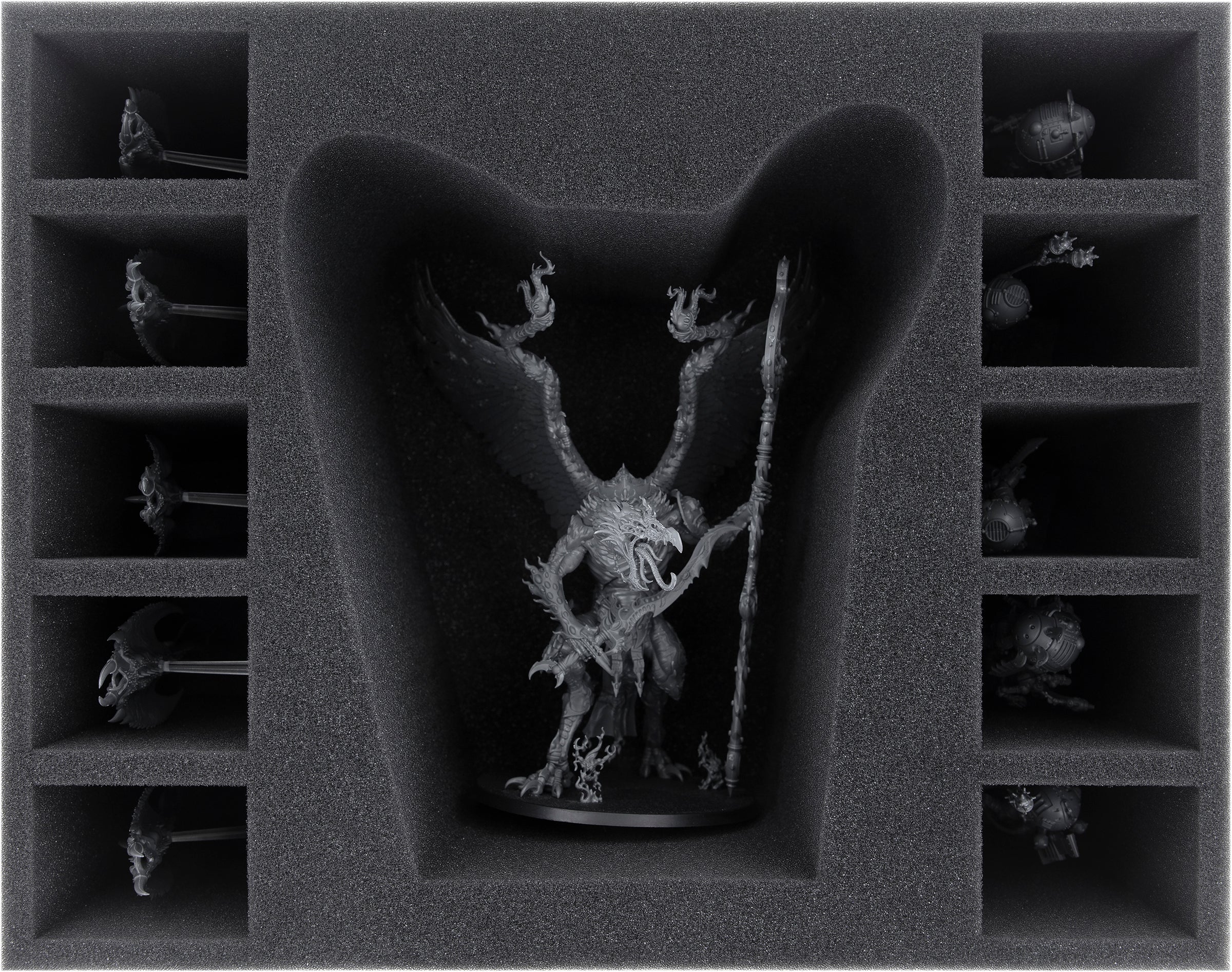 - 1 Half-Size foam tray with 5 compartments for Daemon Prince, Fateskimmer/Burning Chariot of Tzeentch, Pink Horrors and miniatures with similar dimensions (HS105A110)