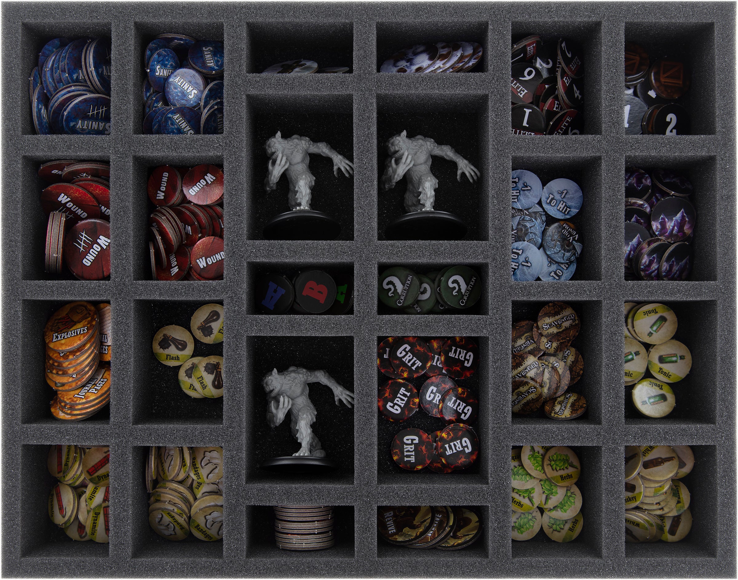 - 1 Full-Size foam tray with 26 compartments for miniatures and game material (FSJQ050BO)