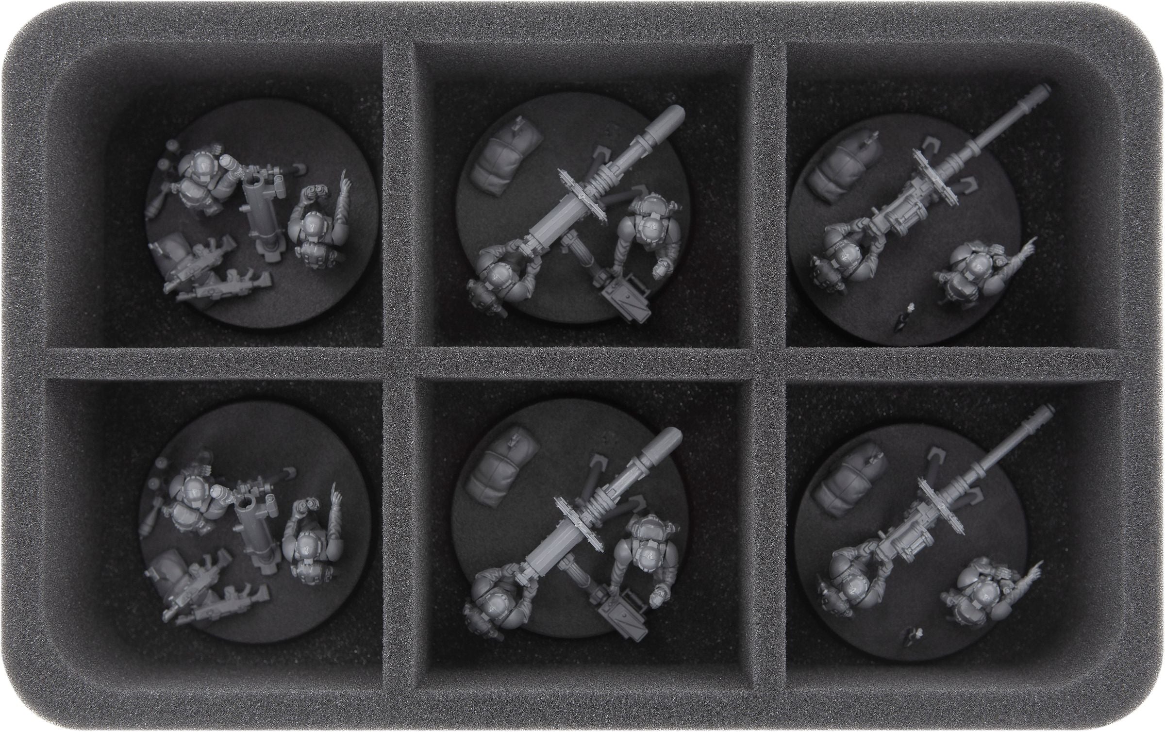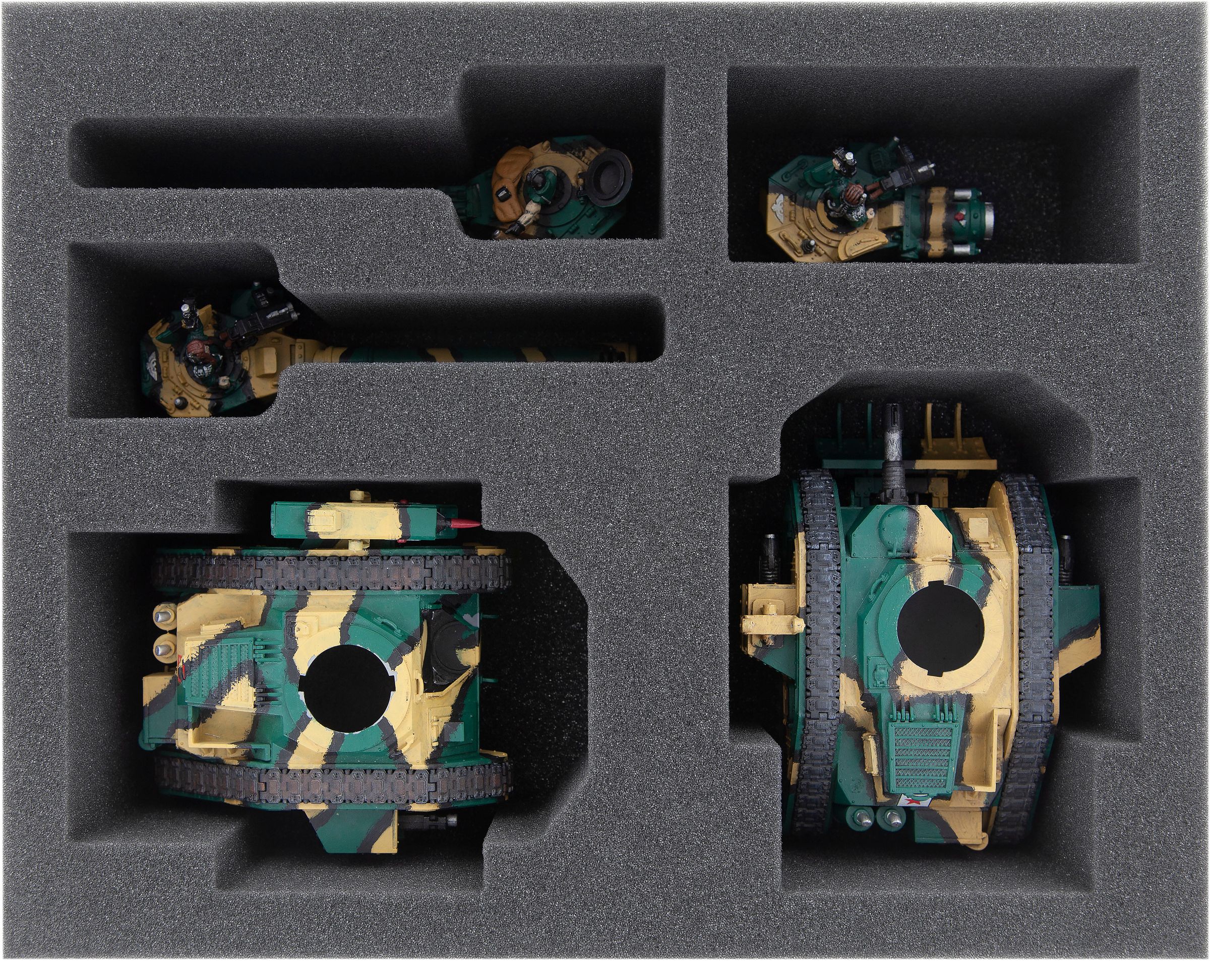 Four Full-Size and two Half-Size foam trays keep your Guardsmen and tanks safe and organized. Custom-fit compartments for each miniature prevent the figures from sliding around or bumping into each other during transport. This way you ensure that the weapons and equipment remain on the model. Plus, the soft foam protects the colors of your painted figures from abrasion and scratches.