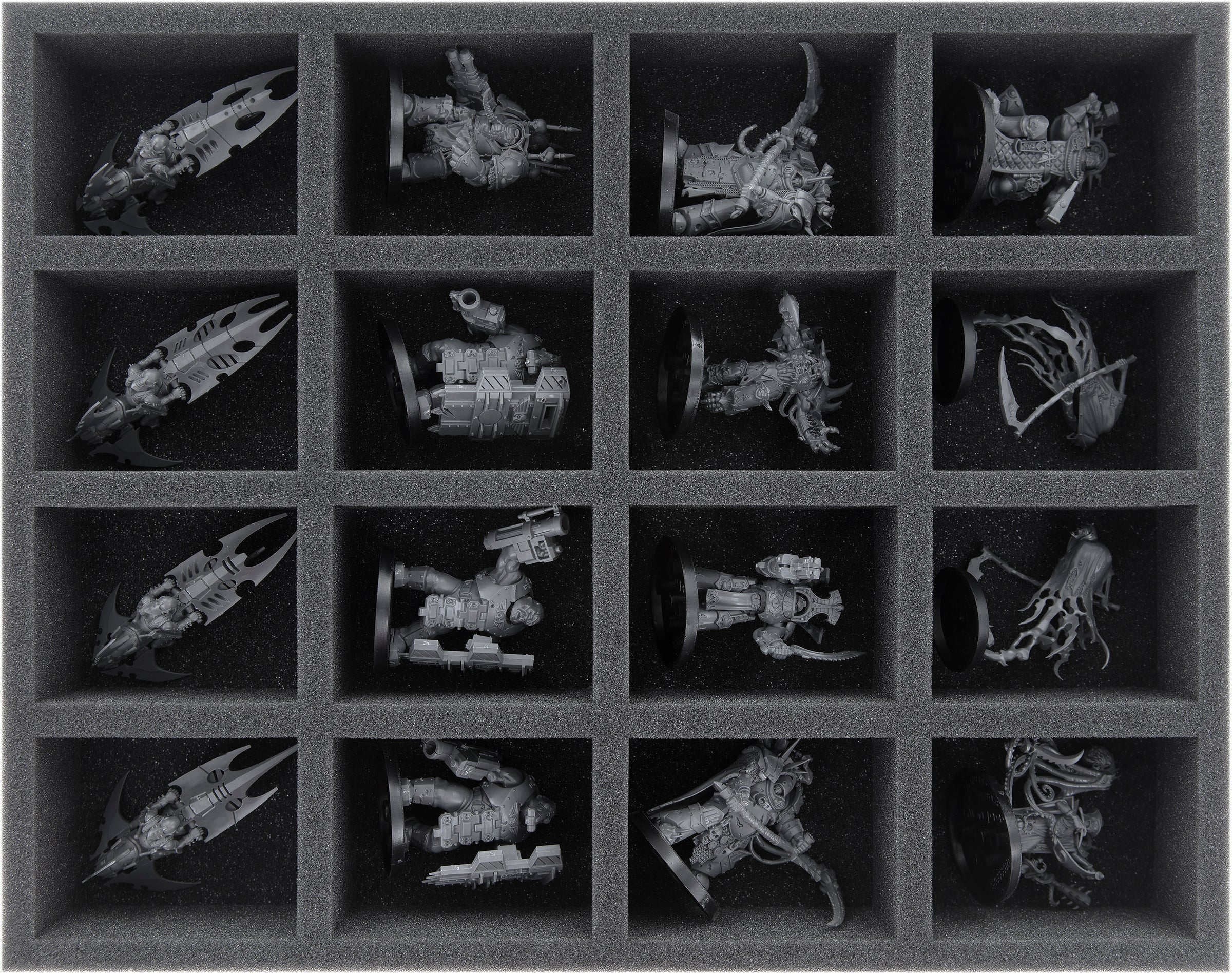 Big, strong and dumb, the Abhumans are ideal cannon fodder for the front row. In the Full-Size foam tray with 16 equally sized compartments, you can store especially well Bullgryns, Ogryns, or Nork Deddog and similar bulky models.