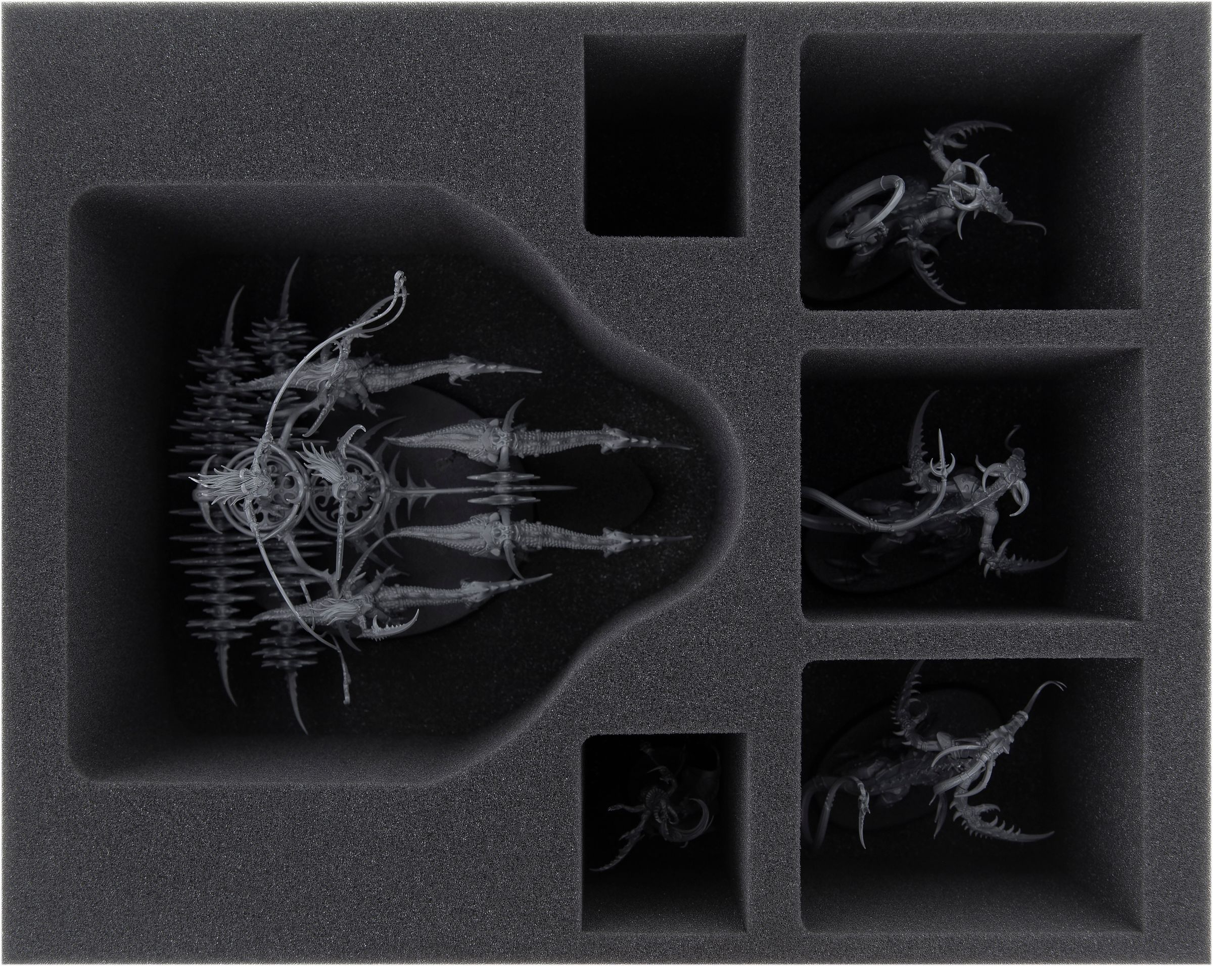 - 1 Full-Size foam tray with 5 compartments for e.g. 1 Keeper of Secrets or Shalaxi Helbane + larger miniatures like Infernal Enrapturess, Fiends, Daemonettes, Banner Bearer, Musicians (FSMEOG135BO)