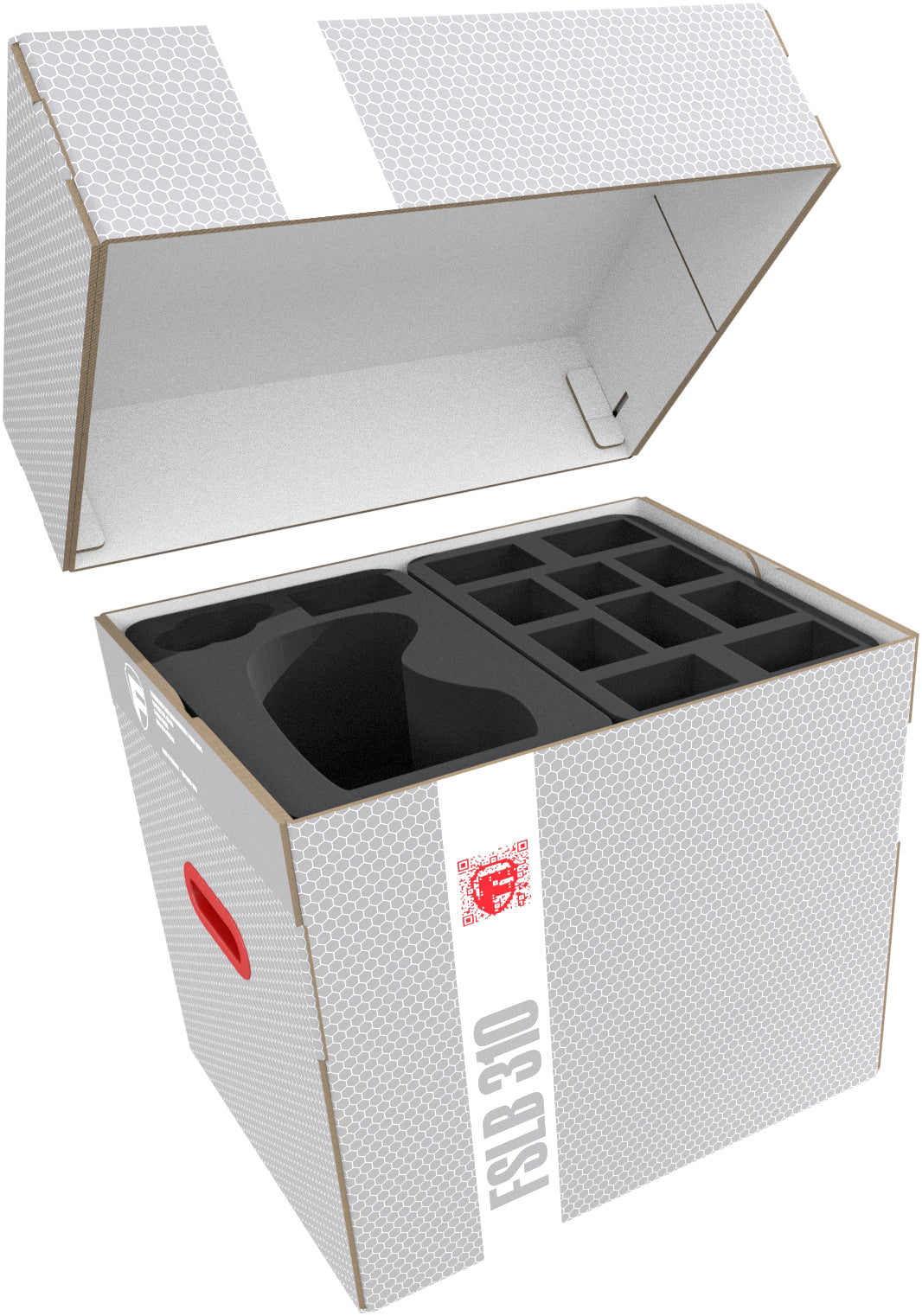 The Storage Box FSLB310 is made of coated, double-walled cardboard. This makes it not only pleasantly light but also very tear-resistant and stable. The attachable lid reliably protects the contents from dust and other external influences. With the appropriate foam trays, miniatures, game material, and all other goods can be stored safely - and conveniently transported with the two plastic-reinforced carrying handles on the sides.