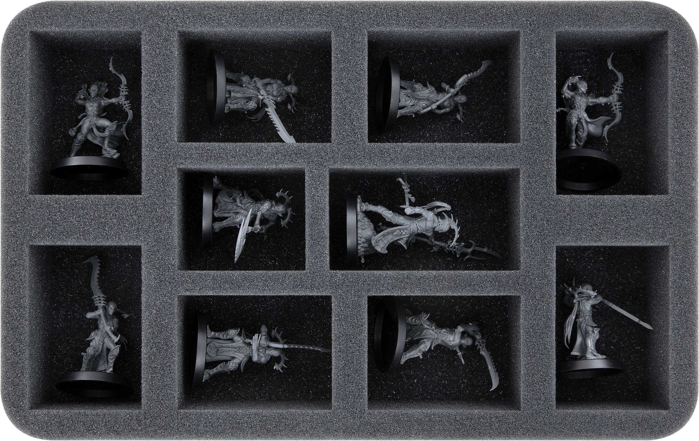 The insert with ten compartments provides enough room for larger miniatures on bases up to 40 mm. In addition to standard infantry like Namarthi Thralls or Reavers, you can also give protruding figures like the Tidecaster a safe place to store them.