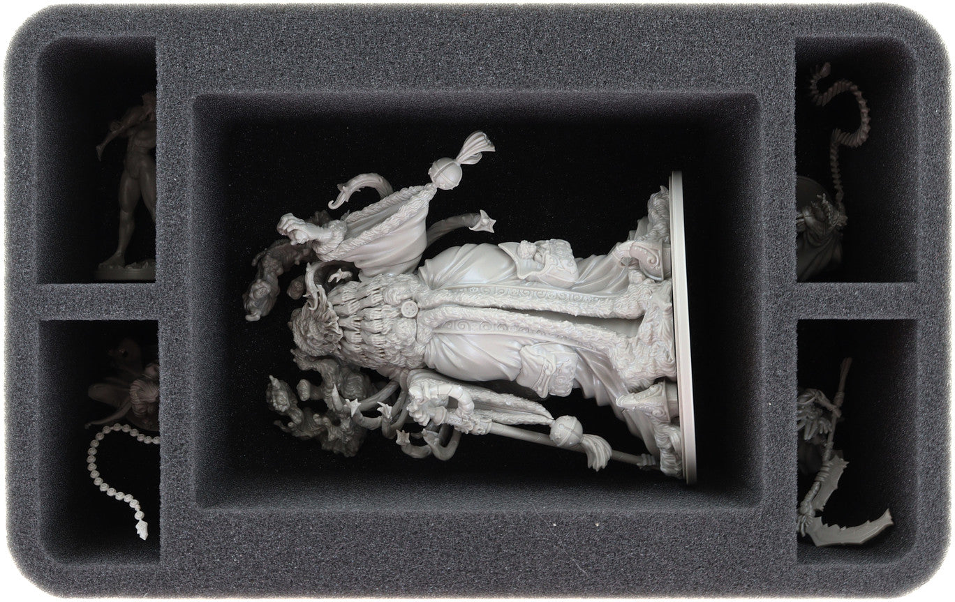 - 1 Half-Size foam tray with 5 compartments for large miniatures like Atnas the Child-Eater and bulky miniatures like Savage Bone Eaters and models with similar dimensions (HSMEVE105BO)